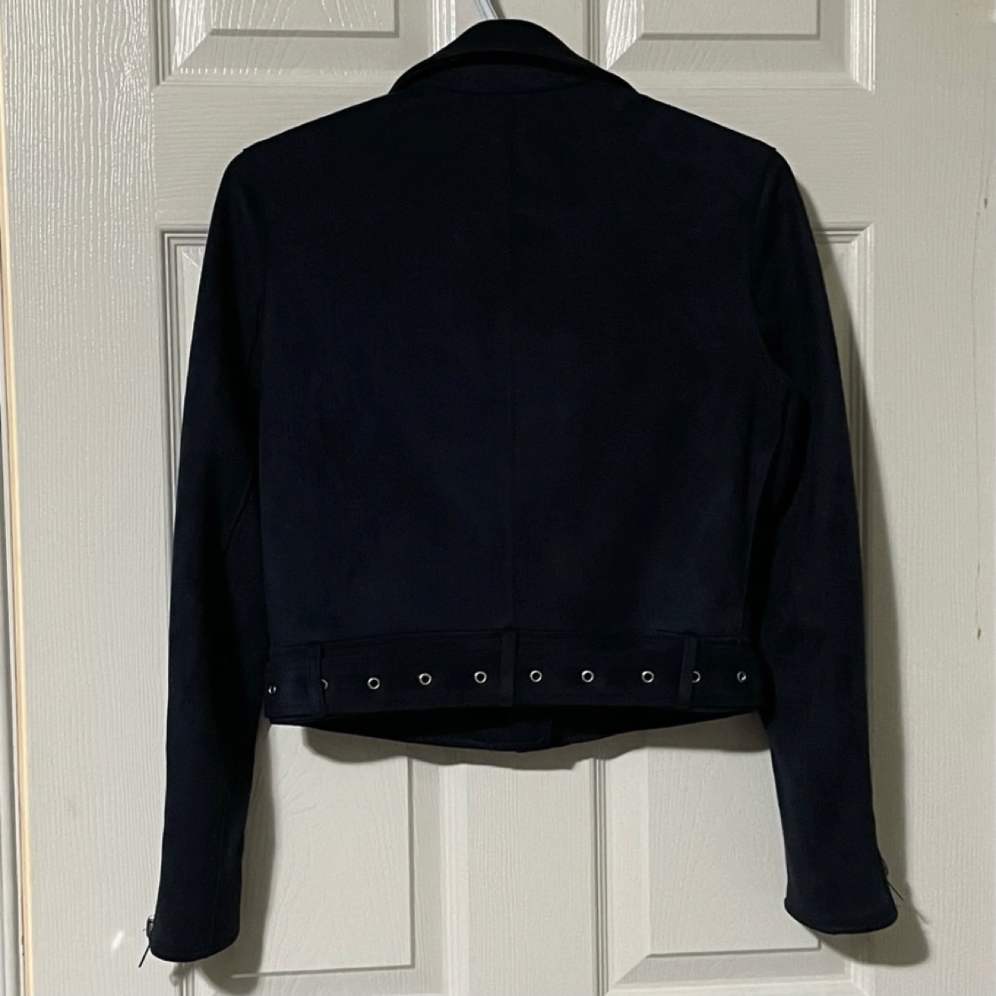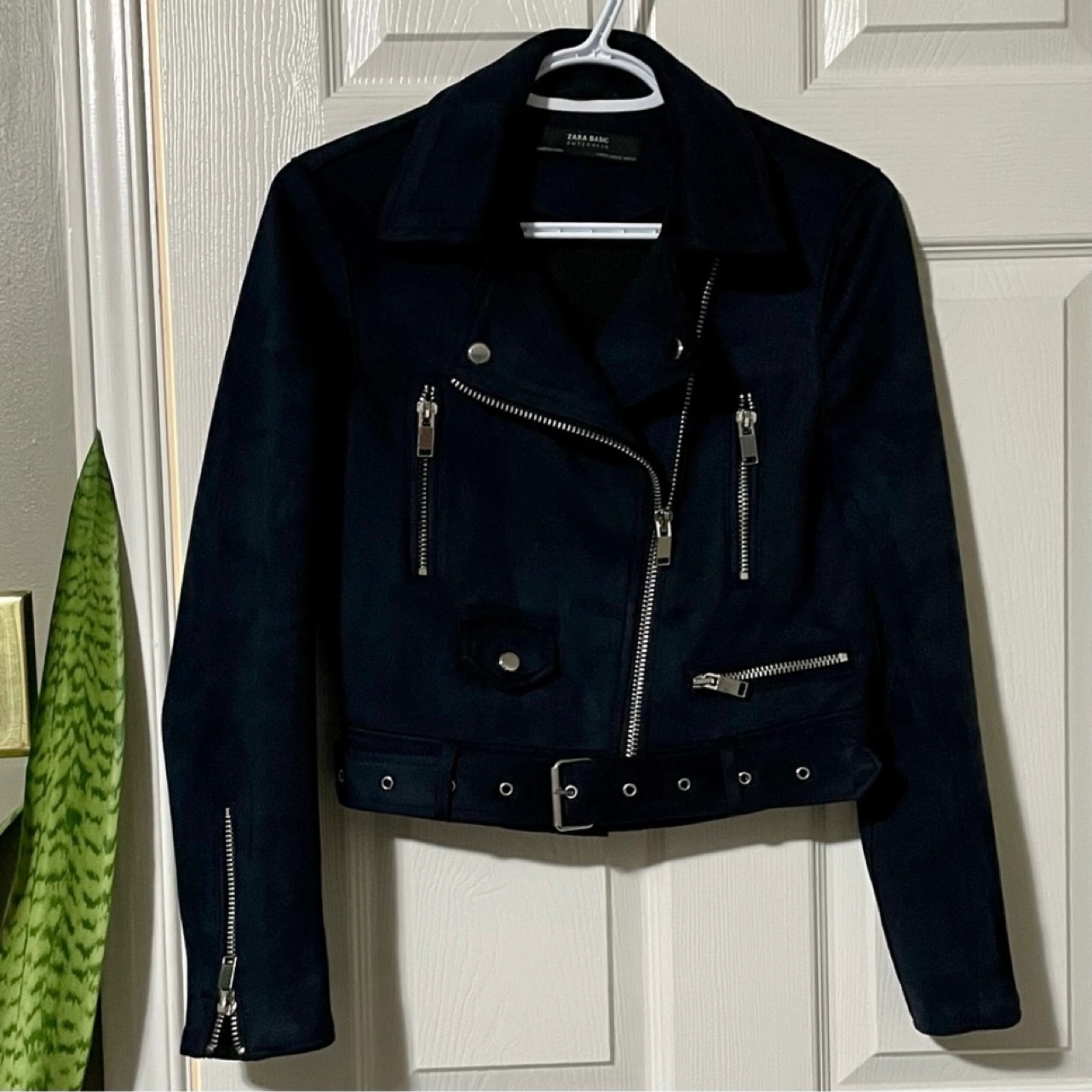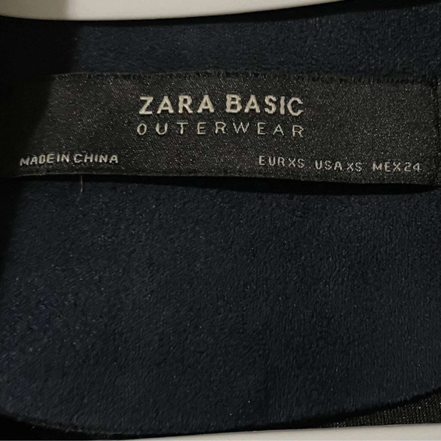 52Zara Faux Suede Jacket with Adjustable Belt. Navy Blue Colour. Size XS Materials: Outer Shell - 100% Polyester Lining - 96% Polyester, 4% Elastane Please note the material tag has been cut.