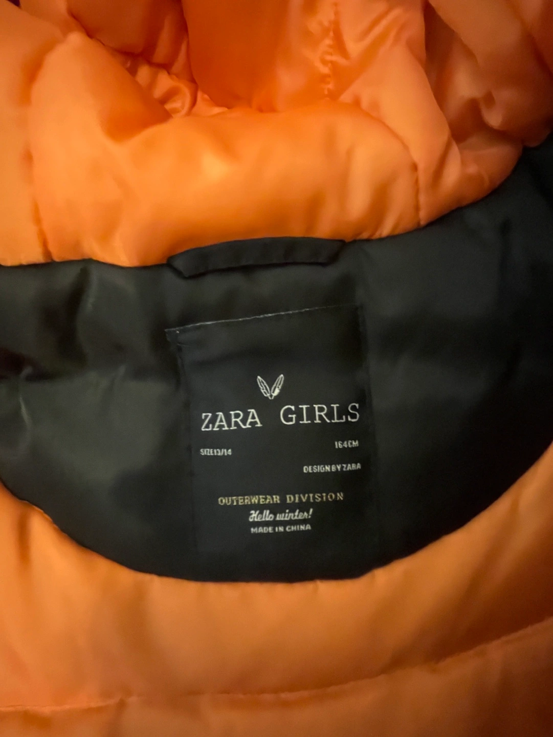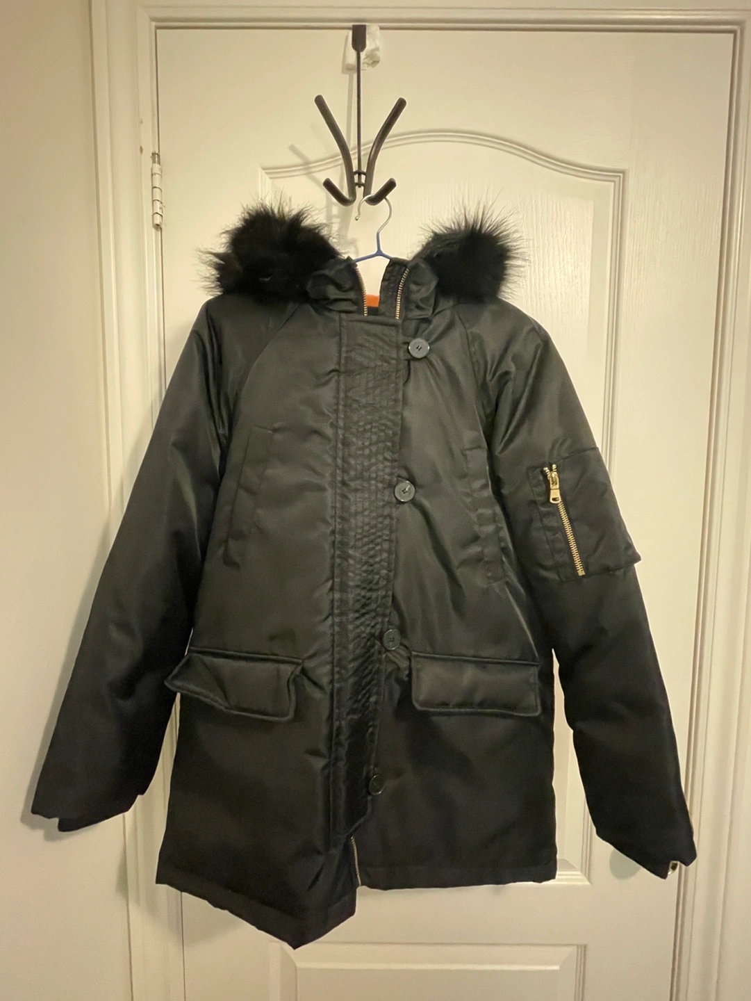 202Black puffer jacket with a fur hood and a zipper and button closure. Size 13/14. Has two pockets on the front and one on the sleeve.