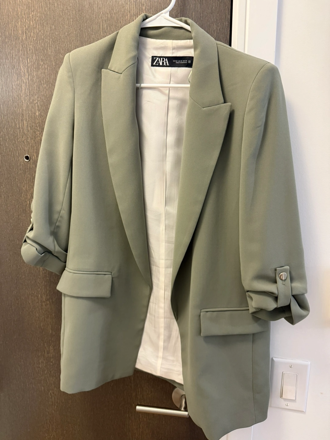 82Green blazer with a collared neckline, long sleeves with buttons, and two pockets.