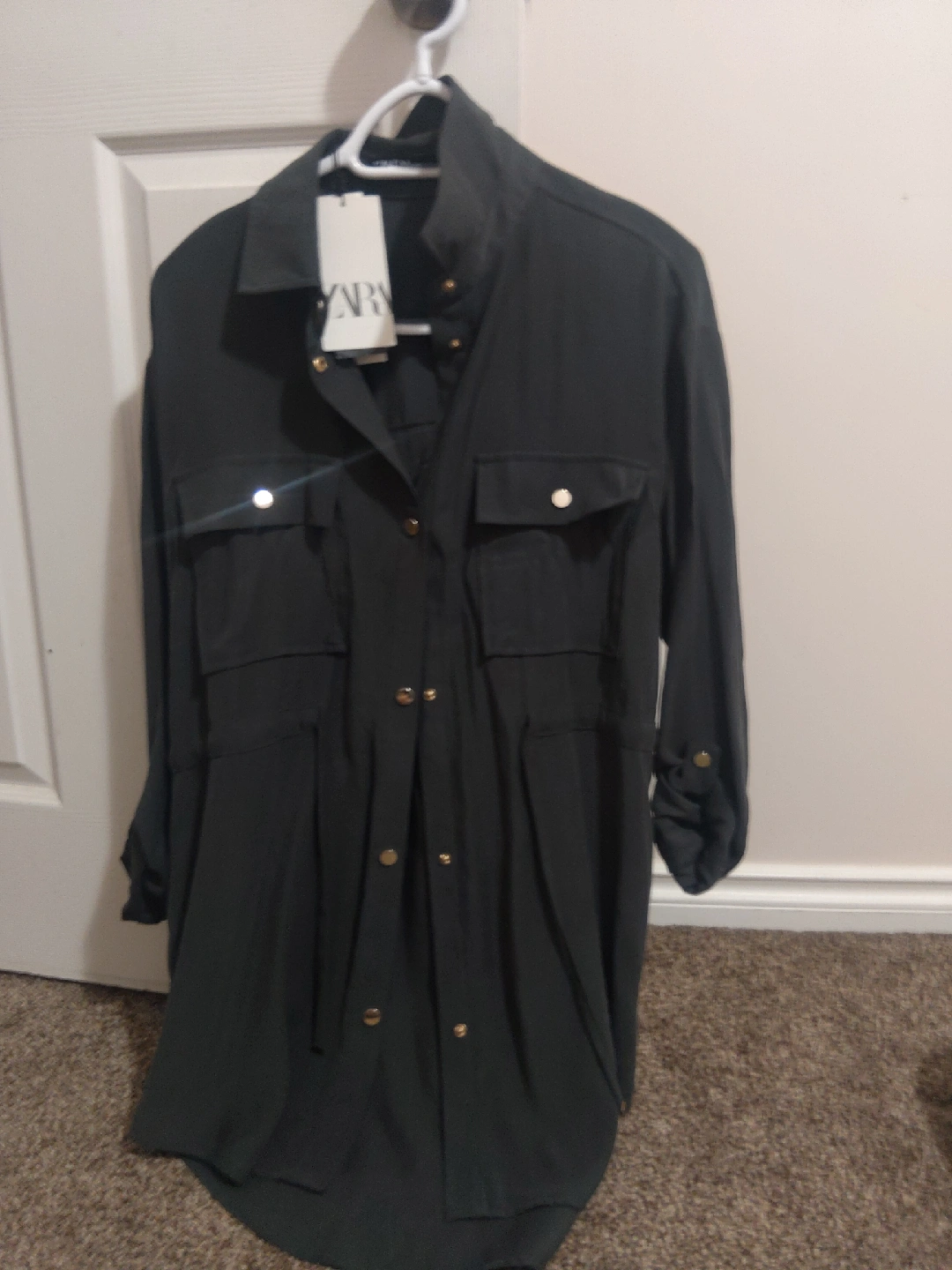 Selling a Zara shirt dress in a lovely green colour! It's a size M and features a button-up front and pockets. Perfect for a casual day out or dressed up for an evening look. The original price was $69.90