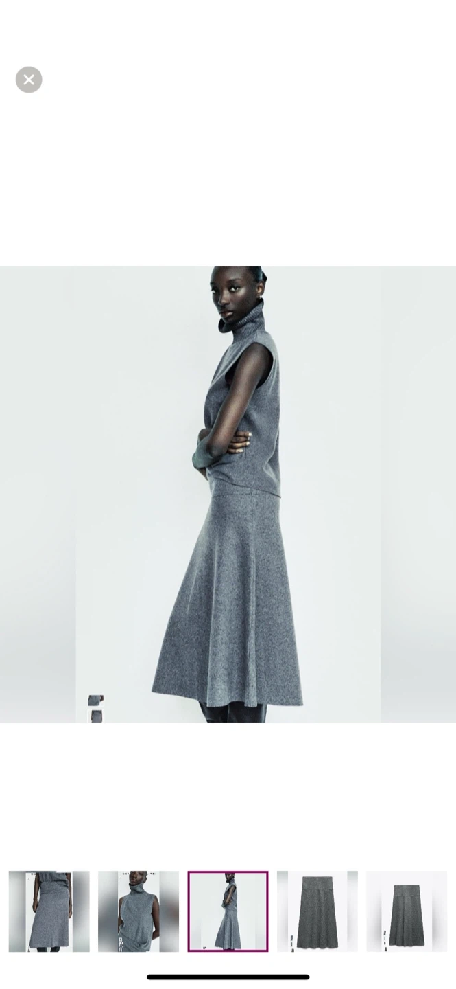 32Selling a Zara knit set in a lovely grey colour! The set includes a sleeveless turtleneck top and a matching midi skirt with a high waist (stretchy). It's made of a comfortable, soft knit. Perfect for a chic and cozy look for autumn & winter! Can be sold separately. Worn once.