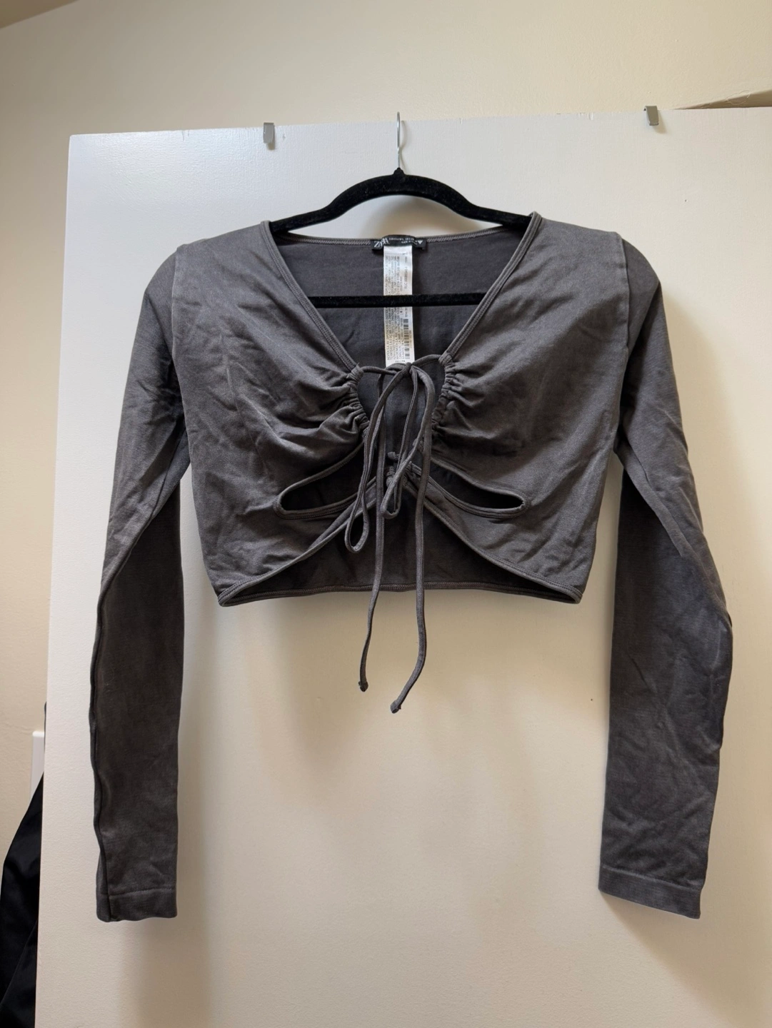 Zara Grey Long Sleeve Tie-Front Crop Top