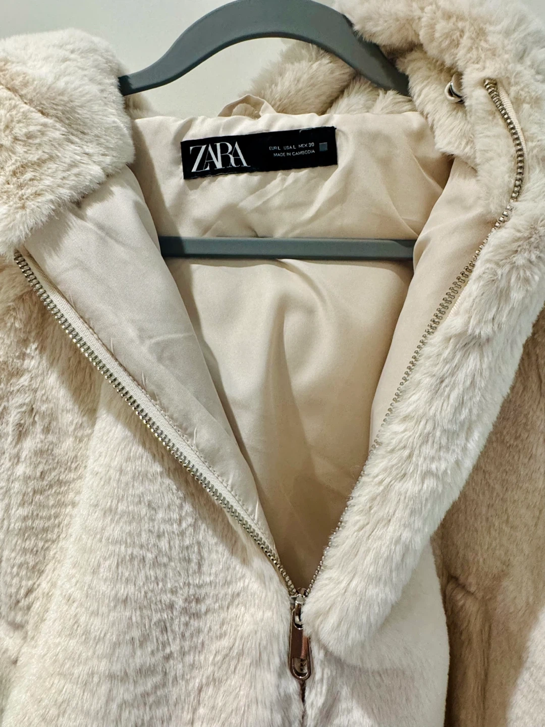 15Zara Faux Fur Hoodie Jacket Ivory Size L New without tags Jacket with hoodie and long sleeves. Side pockets. Adjustable hem with interior side drawstrings. Front zipper closure.