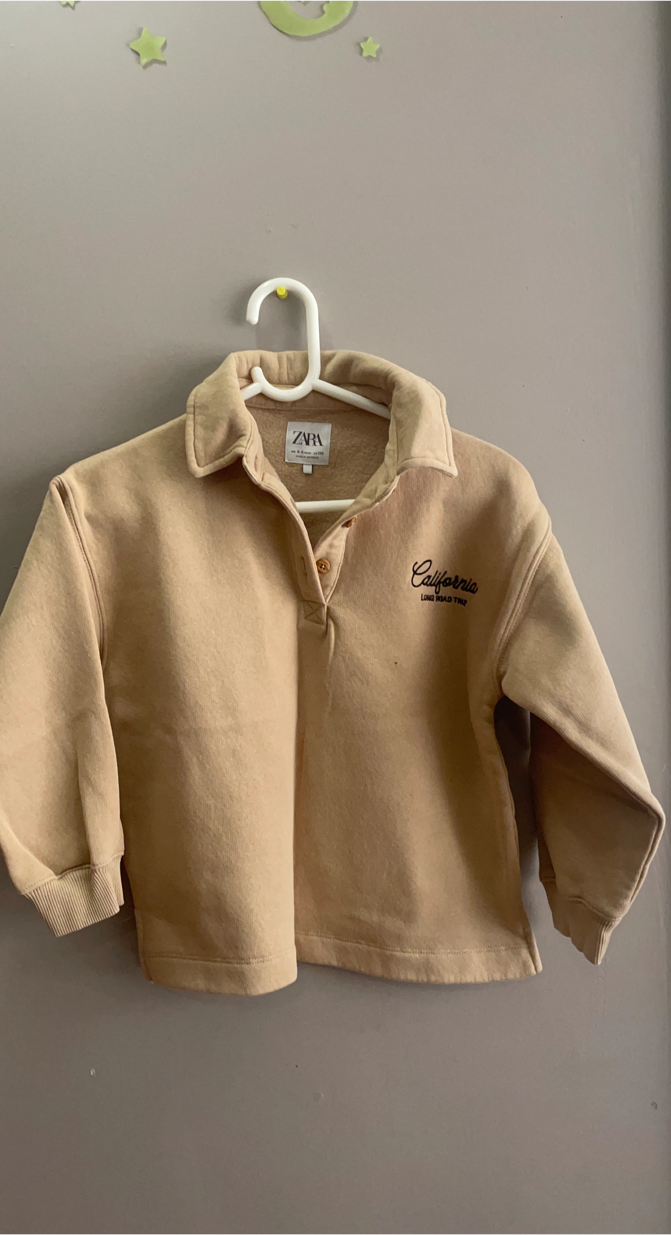 10A cute Zara Kids sweatshirt in a neutral beige colour. It features a polo-style collar with a few buttons and has 'California LONG ROAD TRIP' embroidered on the front. The size is 8-9 years old or 130 cm.