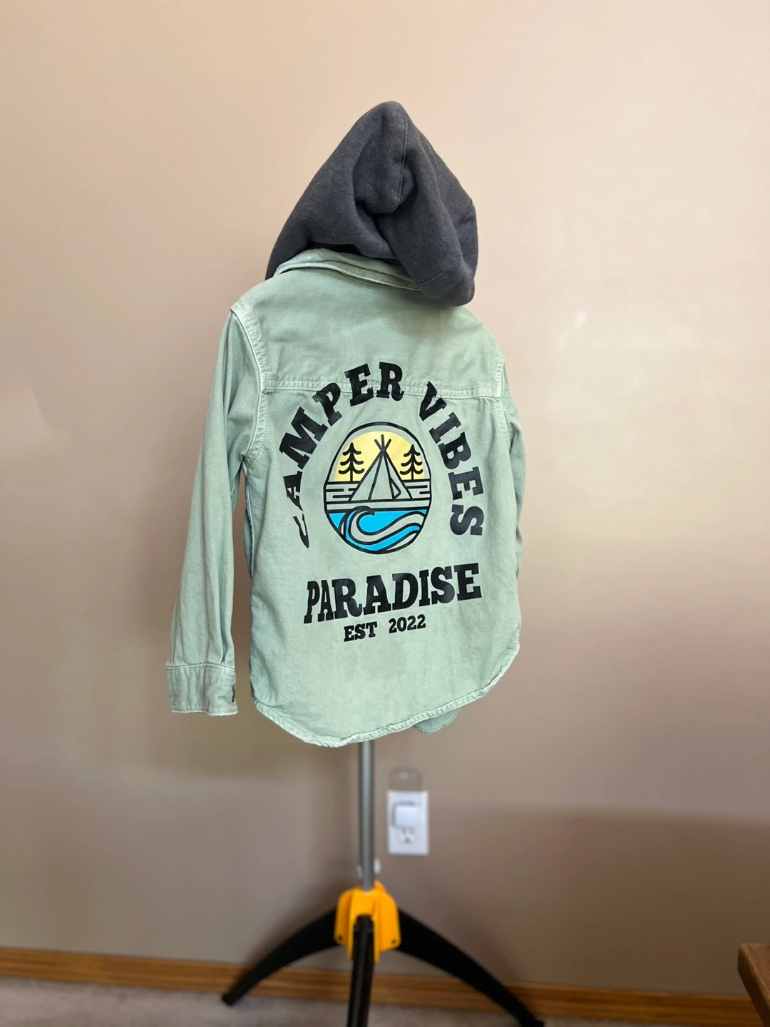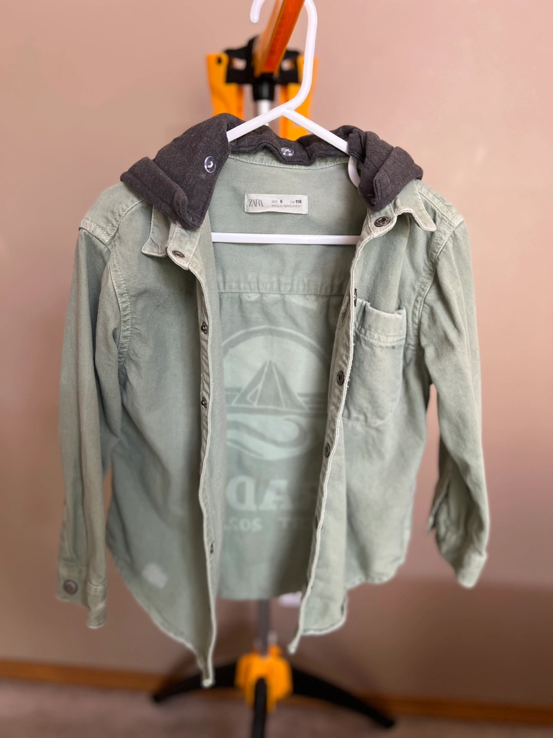 Zara kids hooded shirt in size 6! It’s a light green colour with a dark grey hood.