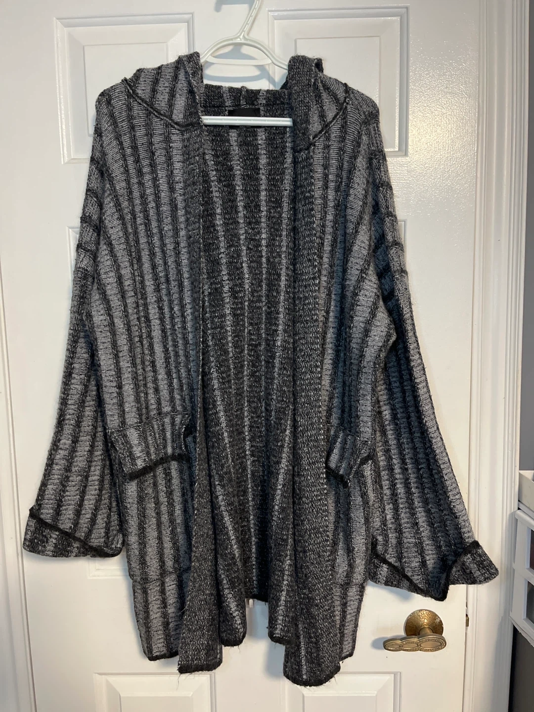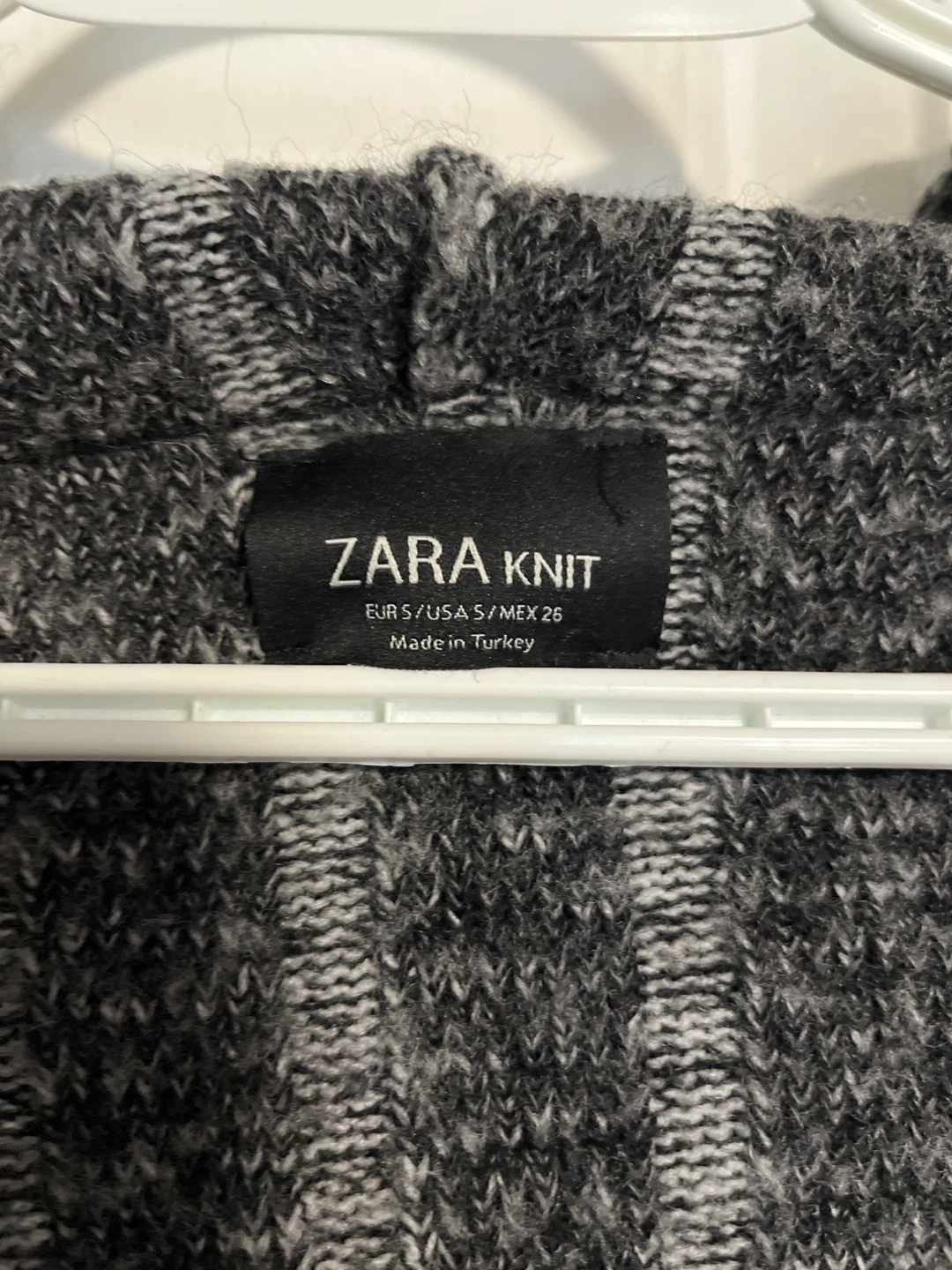 49Selling a Zara Knit hooded cardigan in size S. runs large.It's a stylish and cozy piece, perfect for layering! The cardigan features a unique striped pattern in shades of grey and has a relaxed fit. It's made in Turkey and is in great condition. Perfect for adding a touch of casual elegance to your wardrobe!