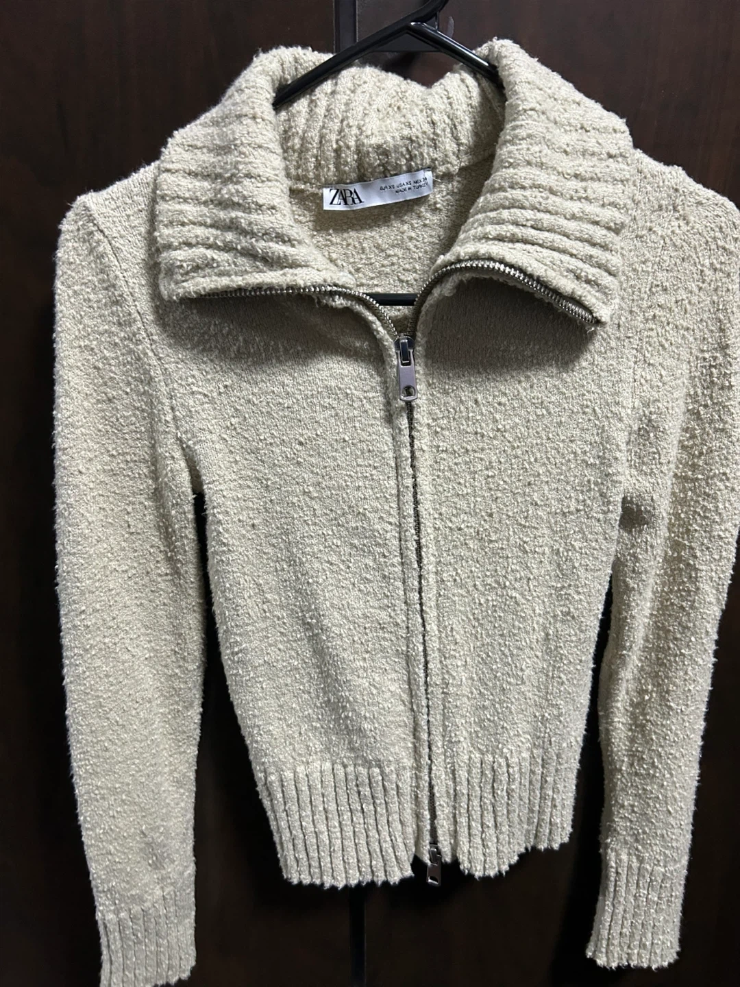 Cozy up in this Zara knit zip-up sweater! The size is XS and the material is a soft knit. Chic greenish textured jacket from Zara. Super cute, idk why but gives tennis vibes to me! Very stylish & never worn! A stylish and comfy addition to your wardrobe! Never worn!!!!!!