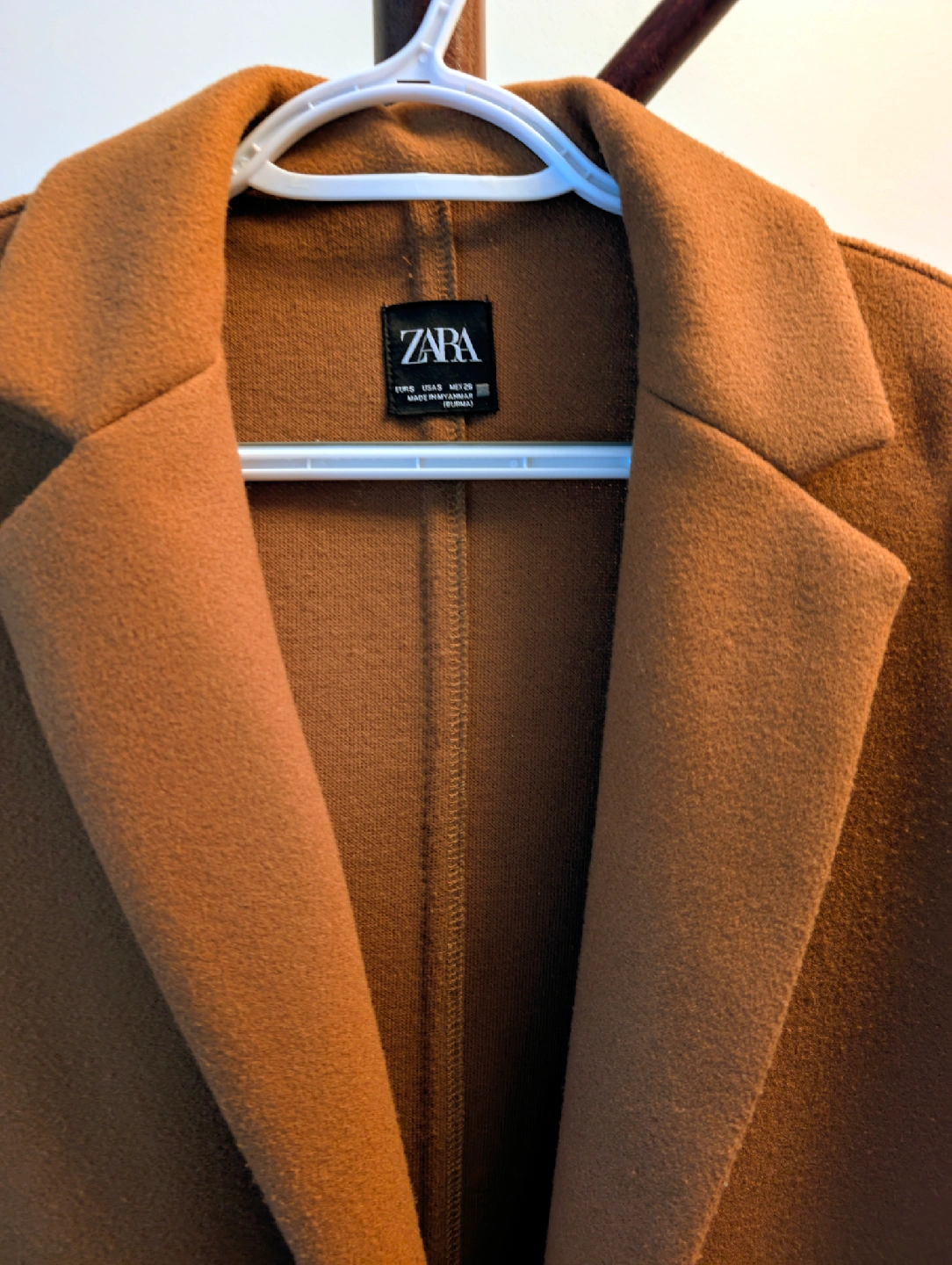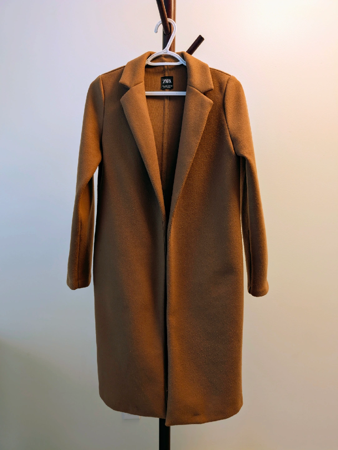Selling a Zara lapel collar coat in a mid-camel colour. Size: Small Condition: Excellent, gently used