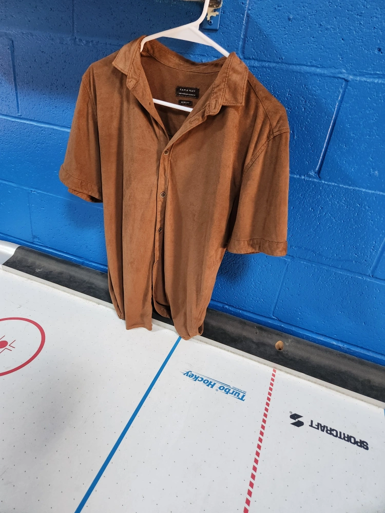 Selling a Zara Man button-up shirt in a nice brown colour. It's a slim fit, perfect for a modern look! The material feels soft and comfortable. Great for casual wear or dressing up a bit