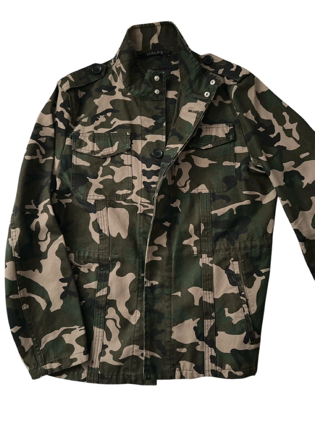 182Men's camouflage print jacket. Long sleeves, button closure. Multiple pockets. Made in Turkey. Good for hiking in Summer and Spring. Used once