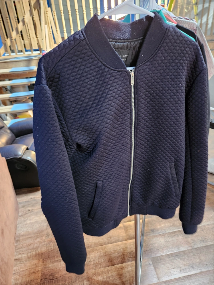 Here's a stylish Zara Man quilted bomber jacket! It's a dark navy colour and features a textured, quilted design. Perfect for adding a bit of style to your wardrobe