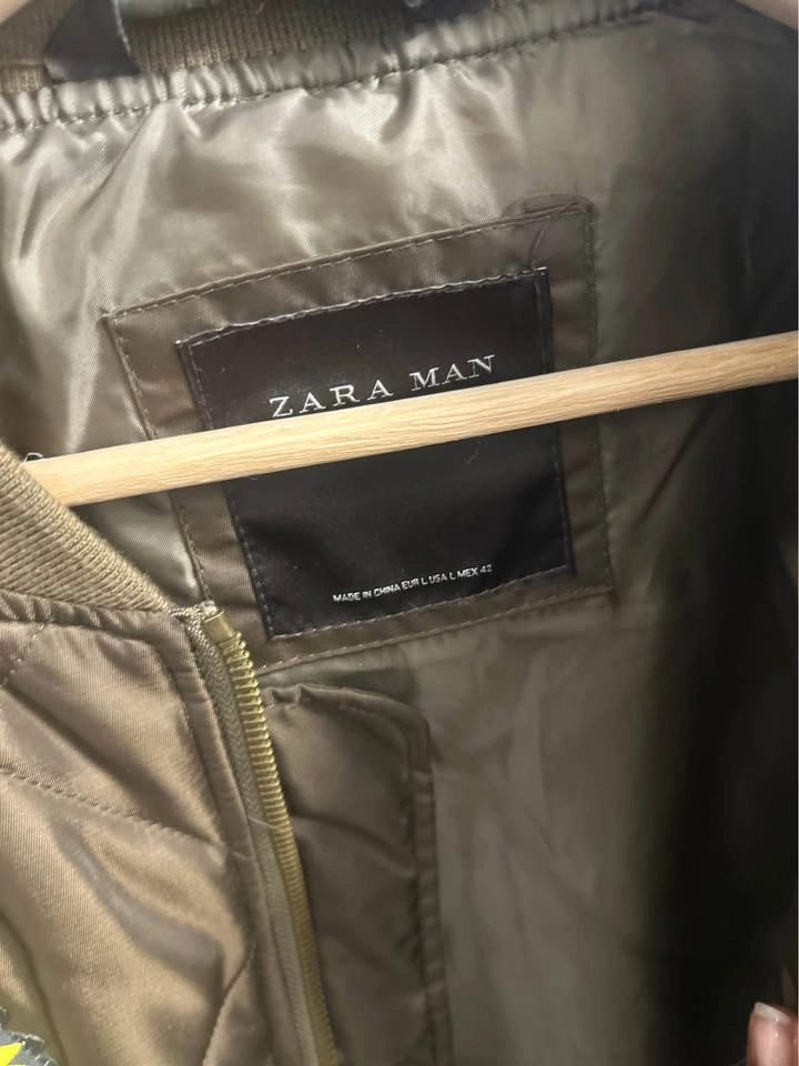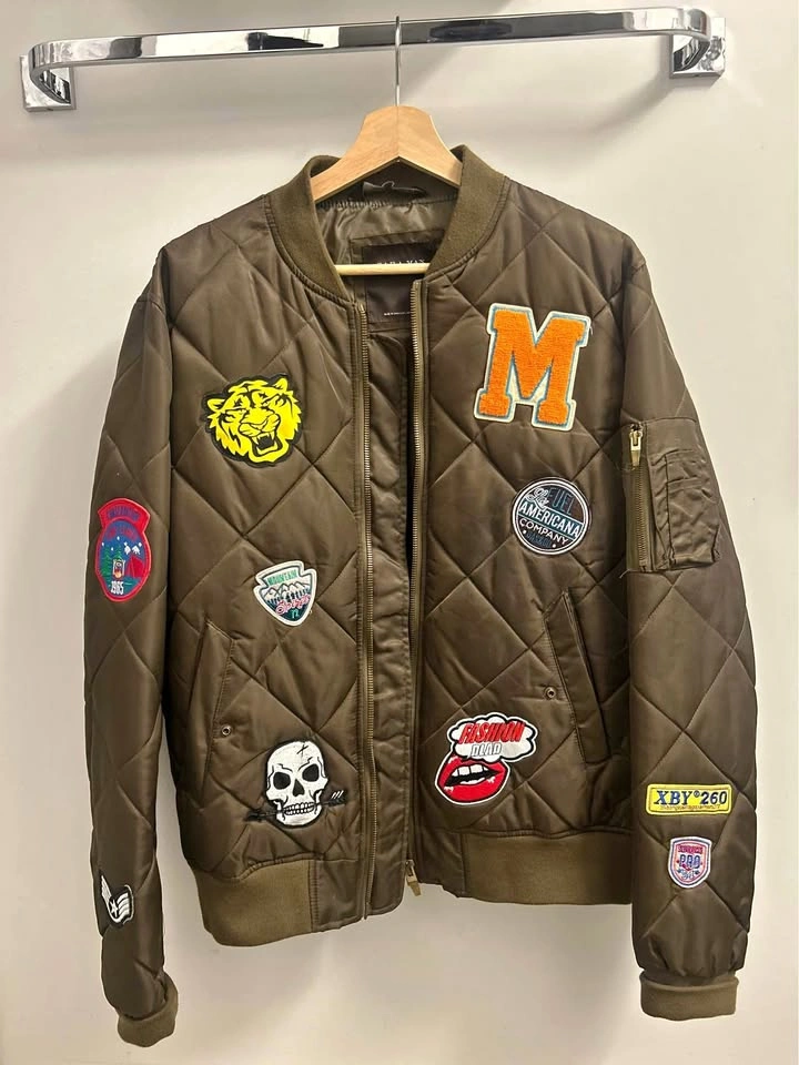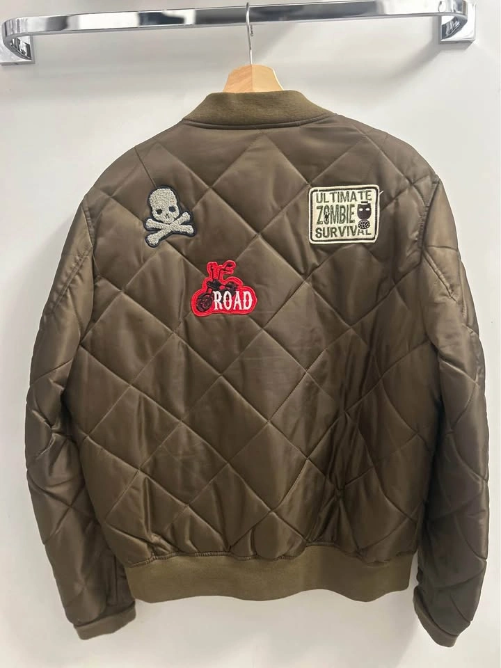 65Olive green quilted bomber covered with unique patches and designs — gives off that cool streetwear/college vibe. Size: Large (EUR L / USA L / MEX 42)