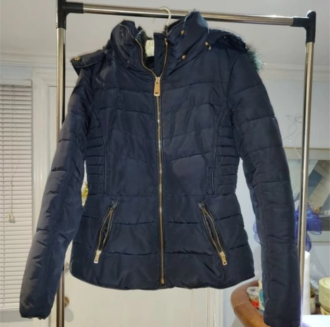 Selling a navy blue puffer jacket! It's in great condition and perfect for the cooler weather. It features a zipper closure and pockets, making it both stylish and practical. Colour: Very Dark Navy Blue with Gold Trim Down filled Smoke free Pet Free SIZE XS | 8/10 Chest - 82 cm | 32.3 inches Waist - 62 cm | 24.4 inches Hips - 90 cm | 35.4 inches For company pics https://www.amazon.ca/Zara-Women-Quilted-jacket-textured/dp/B0764NTYCN
