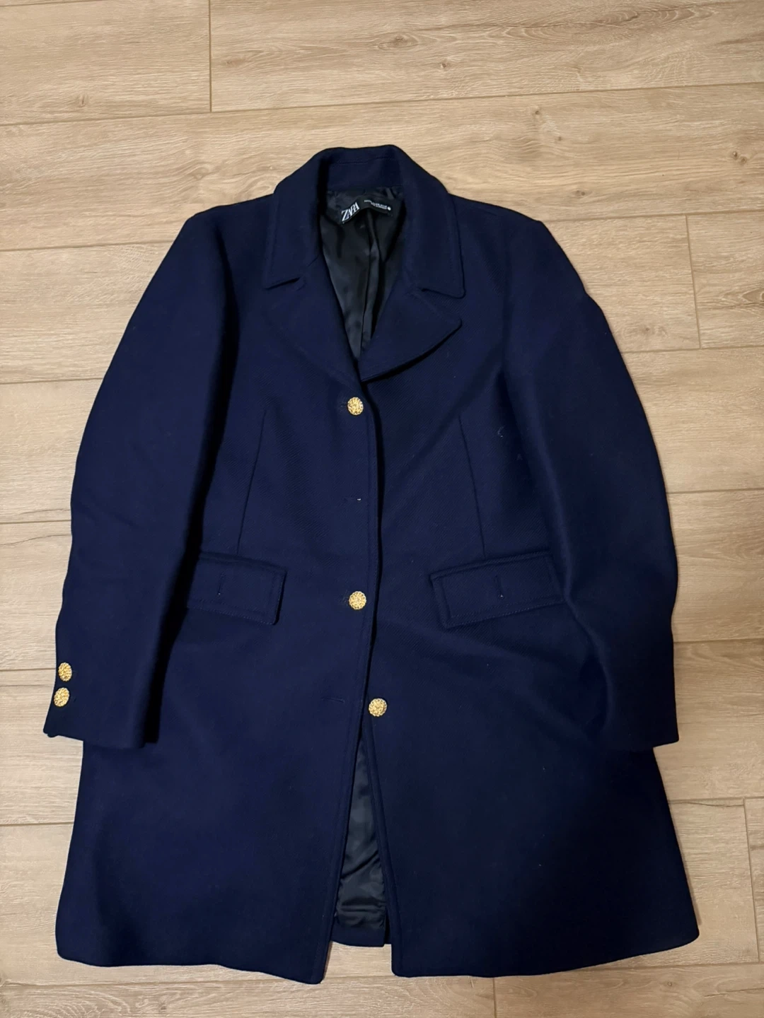 152Zara navy blue wool blend coat in size XXL. It's in great condition and perfect for the cooler weather. The coat features gold-tone buttons and a classic design. Made in Morocco.