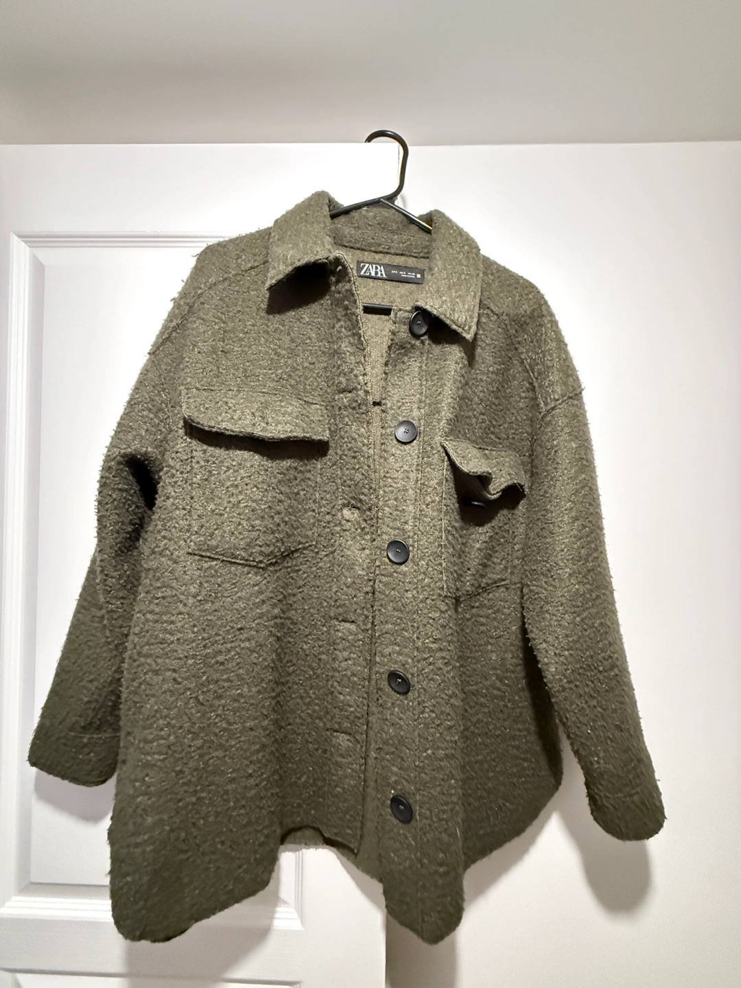 35Cozy Zara shacket in a lovely olive green colour! It's an oversized fit, size small. Perfect for layering during the cooler months!