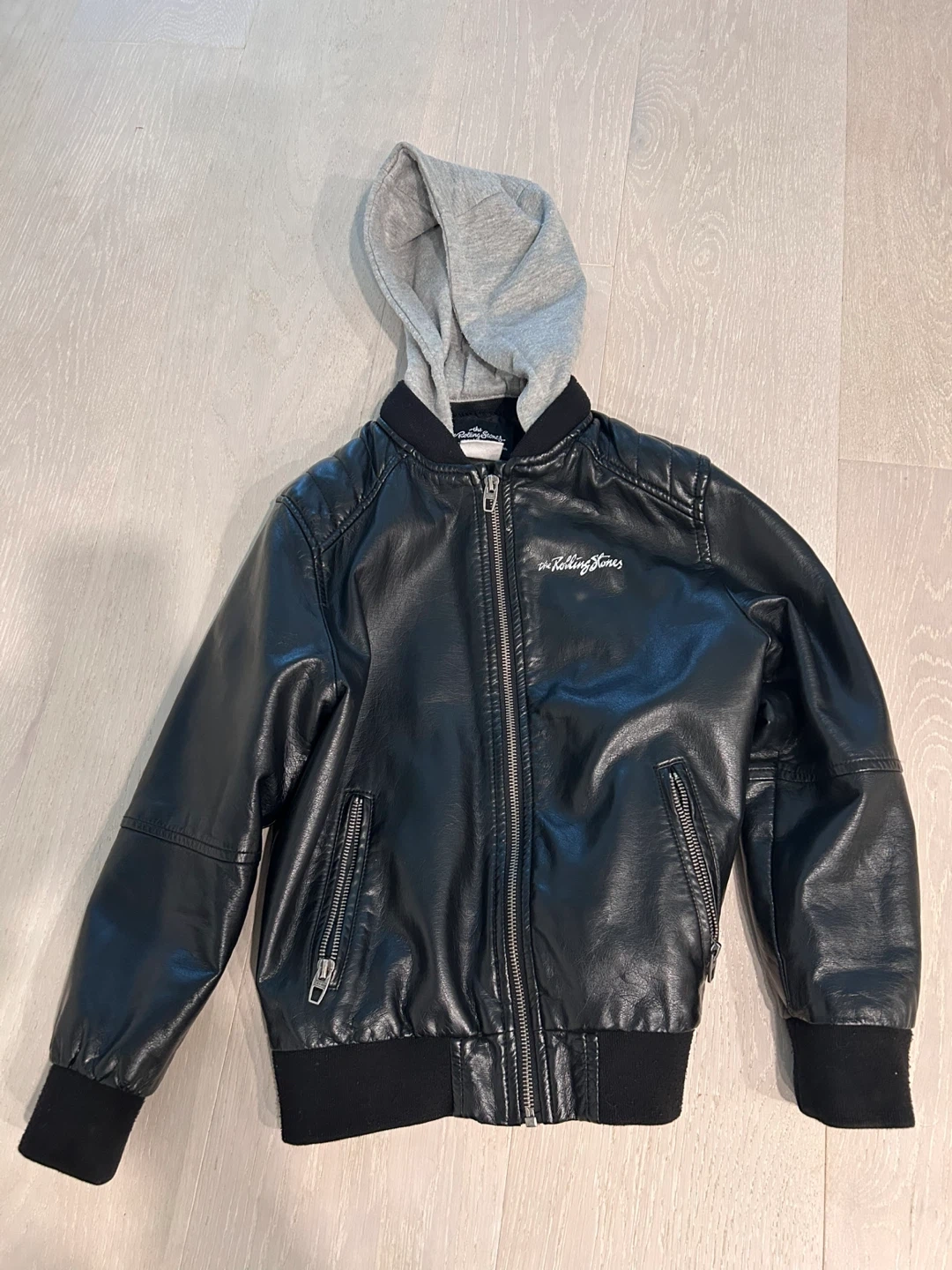 Selling a Zara Rolling Stones hooded jacket in size 8. It's a stylish black jacket with the iconic Rolling Stones logo on the back and a grey hood. Great for any young rock fan!