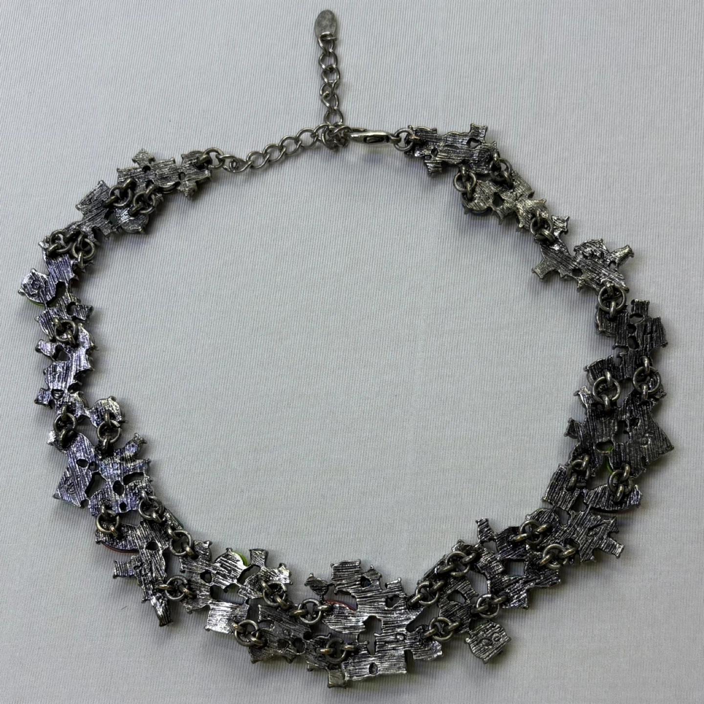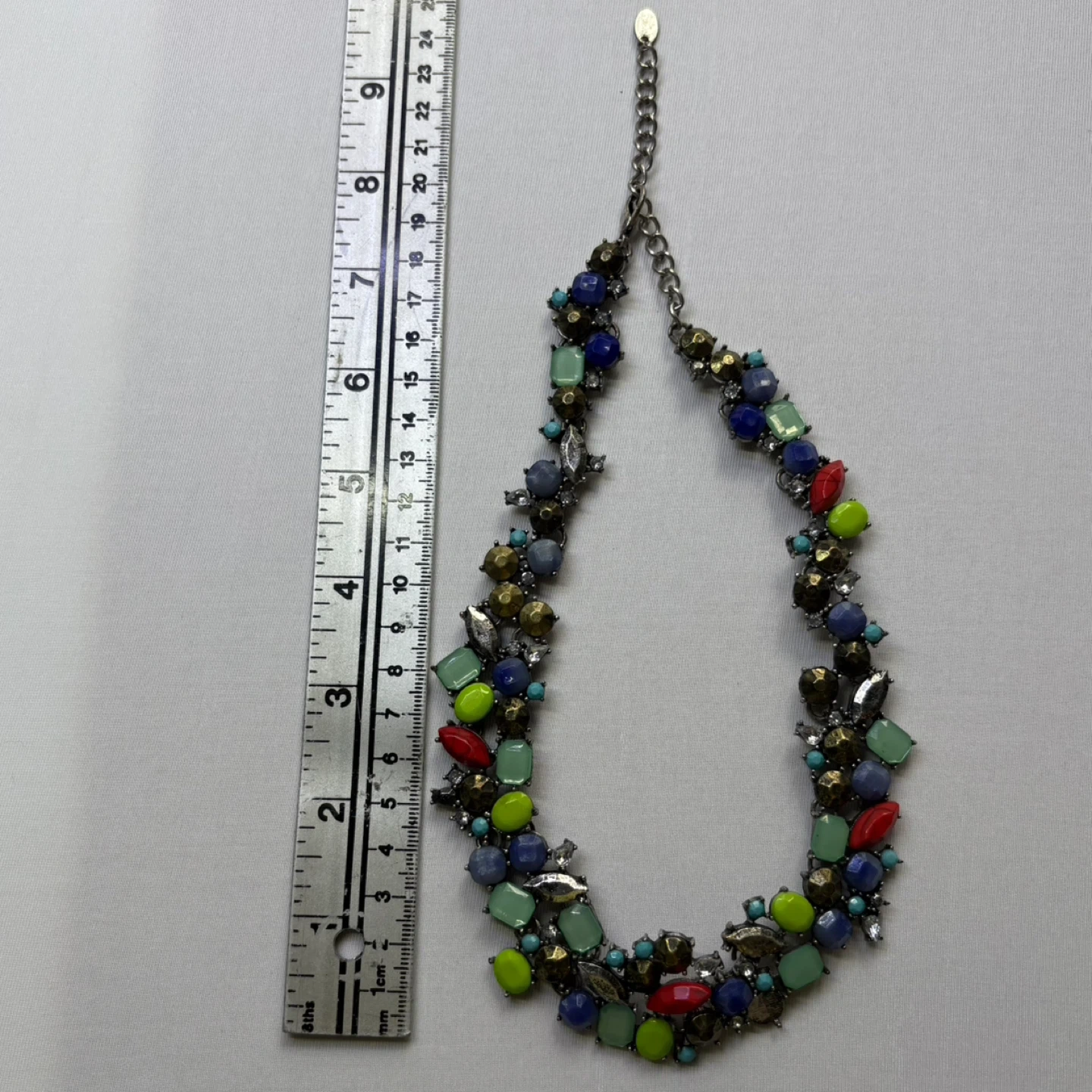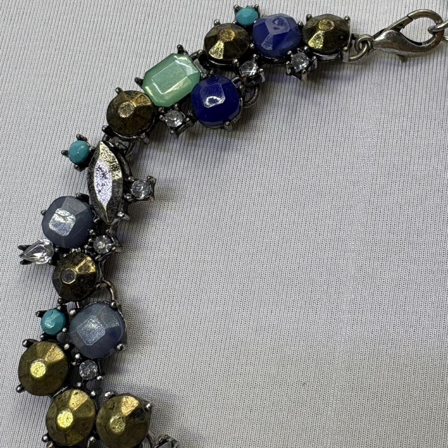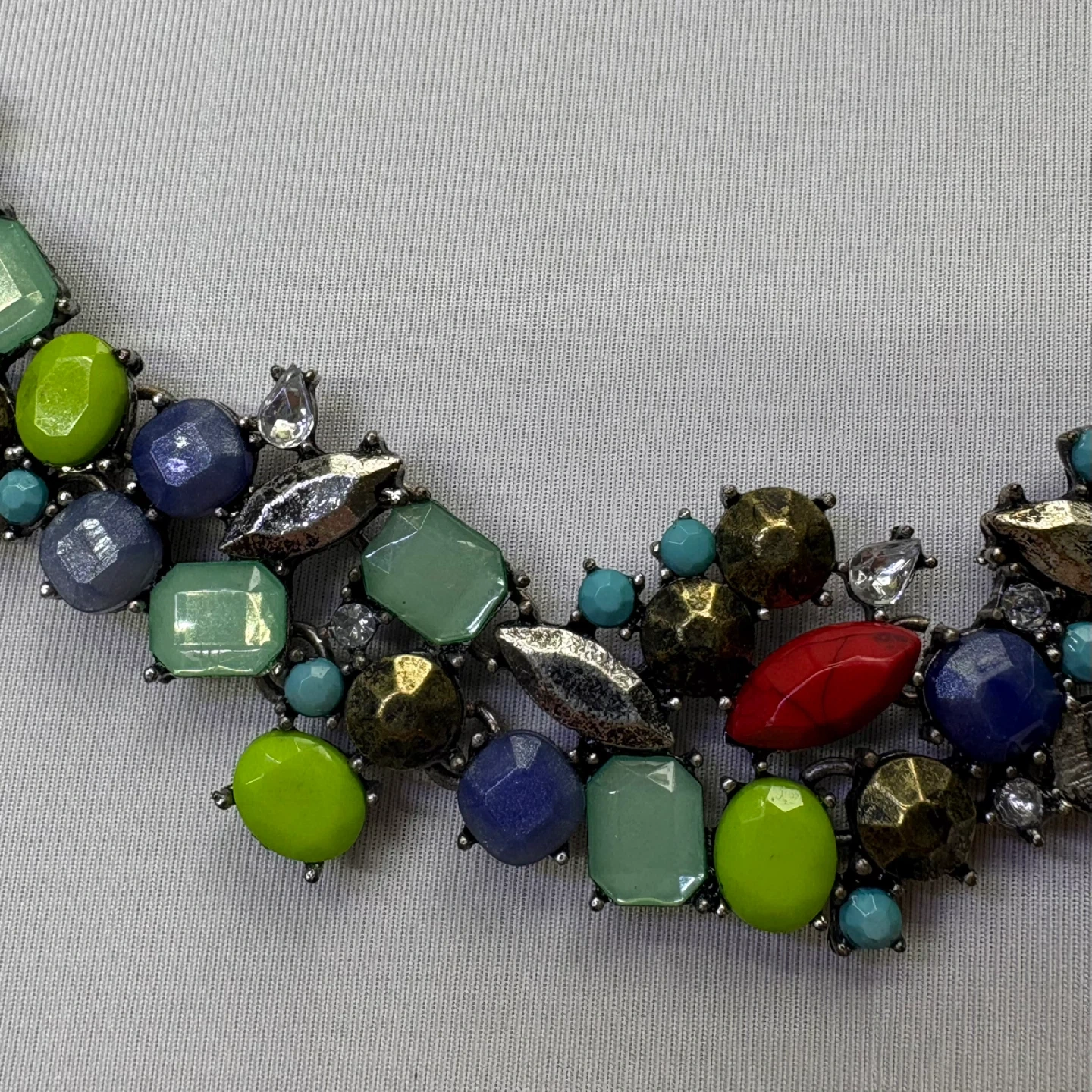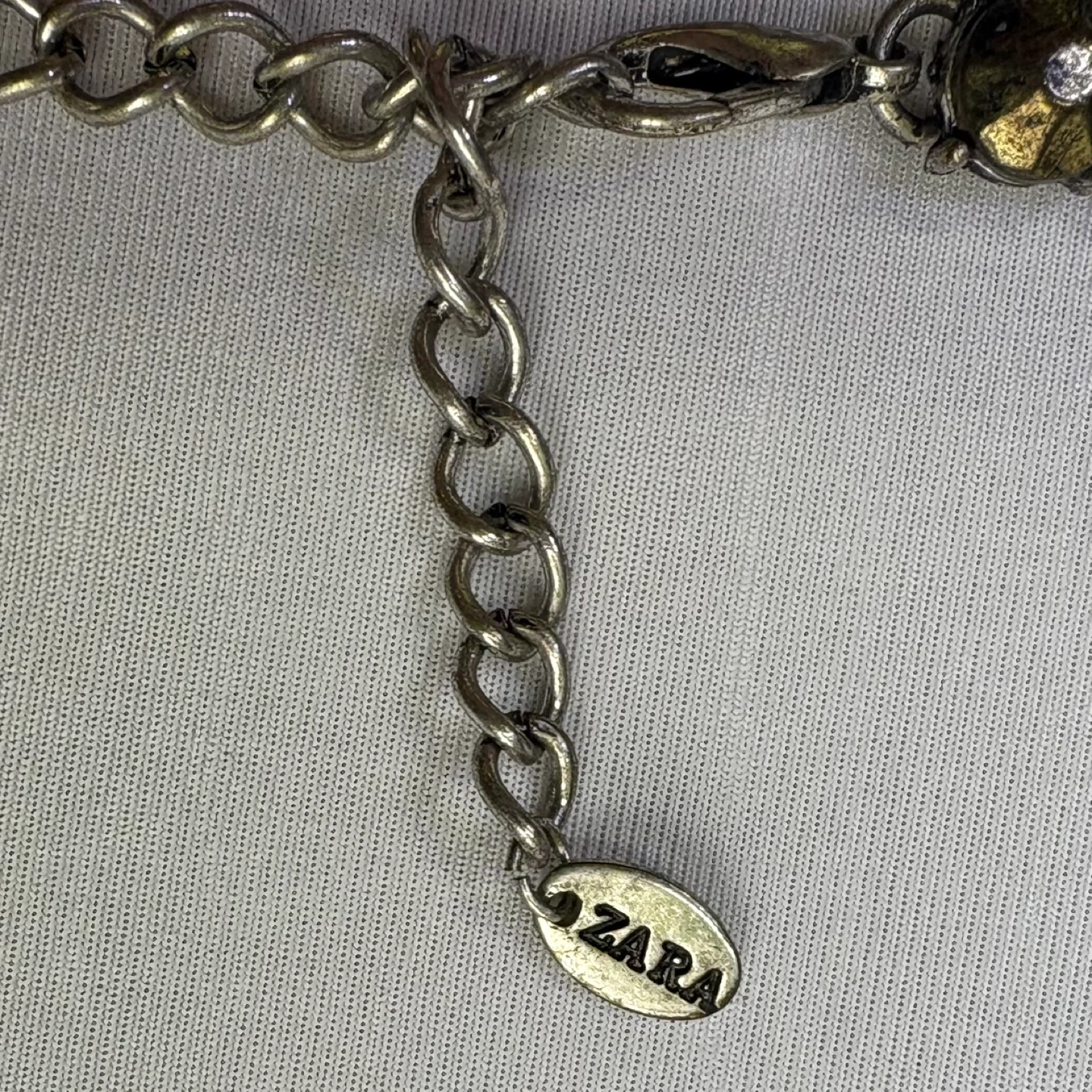 122A stunning Zara statement necklace featuring a mosaic of brightly colored, faceted gemstones and metal accents on a dark, distressed silver-tone setting. This collar necklace showcases an eclectic mix of colours including neon green, red, deep blue, mint green, and metallic pewter, interspersed with small rhinestones and textured beads. The back has an intricate texture, and the chain is adjustable, finished with a lobster clasp and a Zara logo tag. This piece is perfect for adding a bold pop of colour to a simple outfit, ideal for boho, festival, or evening wear. The adjustable chain ensures a comfortable fit as a choker or slightly longer necklace. Keywords: Zara, Statement, Necklace, Choker, Collar, Gem, Embellished, Multicolor, Jewels, Crystal, Festival, Boho, Designer, Jewelry, Fashion, Bold, Chunky, Cocktail, Adjustable Brand: Zara Era: Modern Color: Multicolor (Green, Blue, Red, Silver, Pewter) Print: Gem Embellishment/Mosaic Material: Base Metal, Resin/Plastic Gems Condition: Good Used Condition Size: Adjustable See photos for measurements. Flaws: One small stone is missing in the center front area (pictured). The flaw is not noticeable when worn due to the densely packed design and similar surrounding colours/materials. Cross posted. Winnipeg - Pick up only (Located 2 blocks west of Polo Park). Shipping options available through other platforms message me for details.