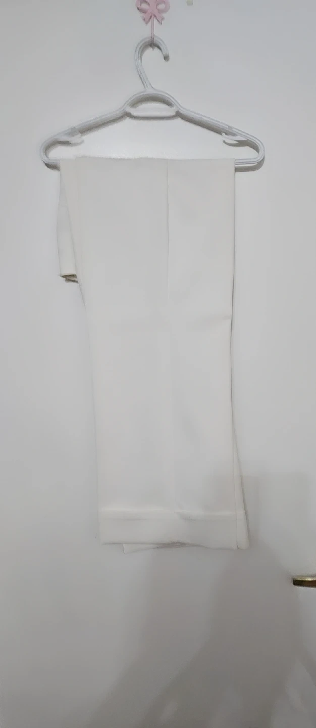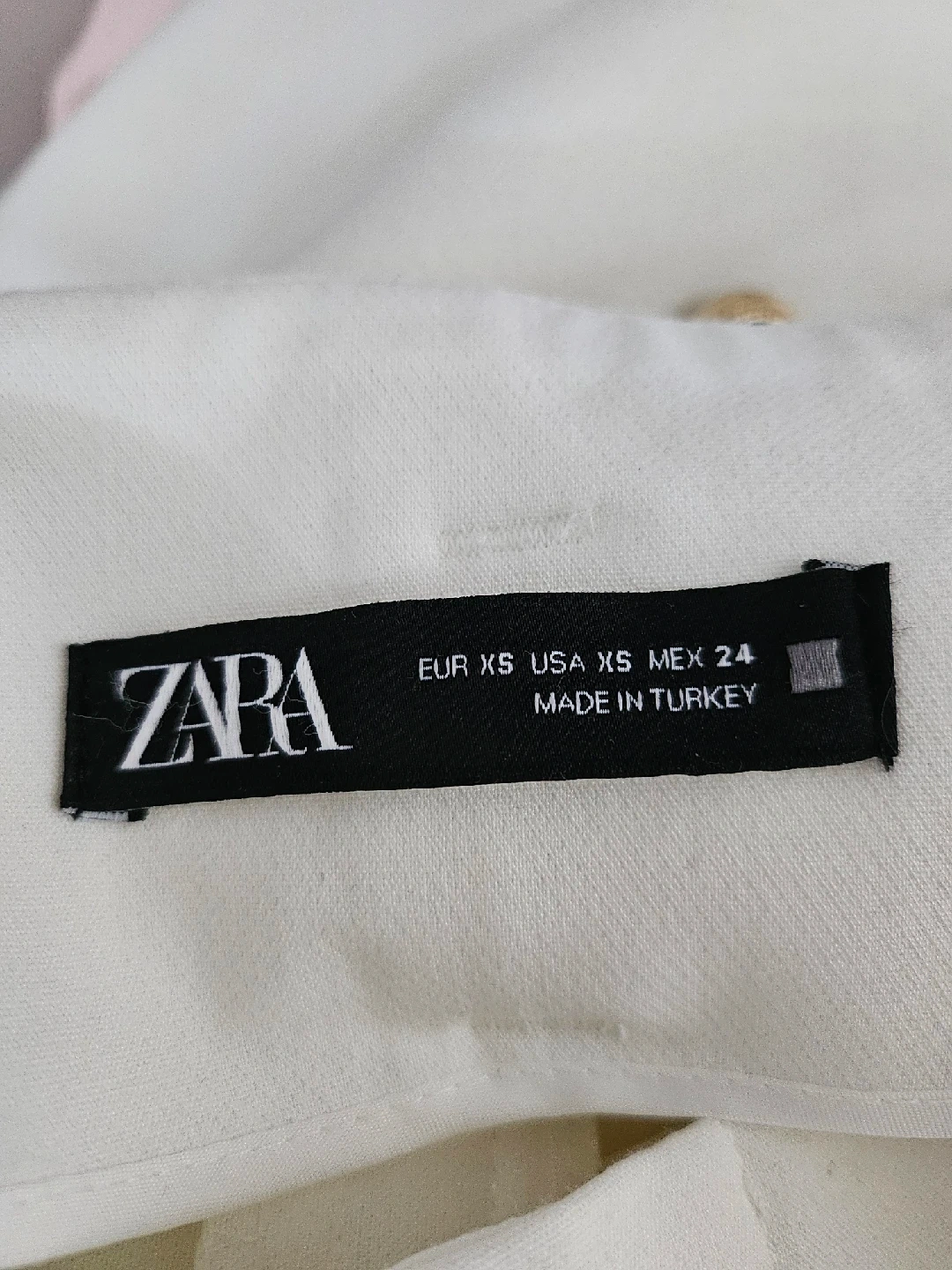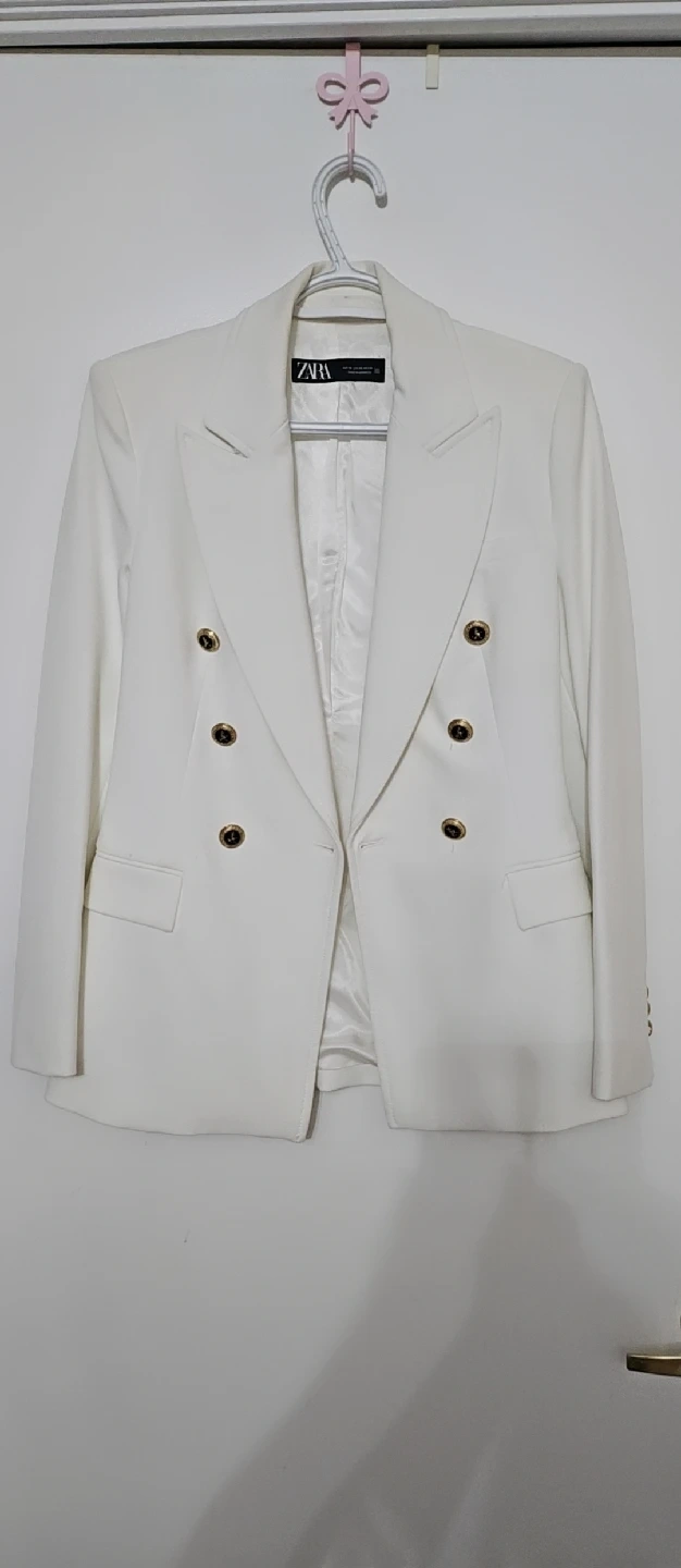 Selling a Zara white suit set, including both the blazer and pants. The blazer is double-breasted with gold-tone buttons. Both pieces are in great condition and ready to wear!