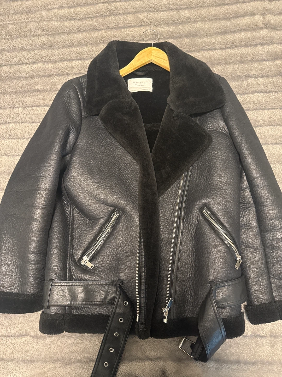 25Selling a Zara Woman black aviator jacket! It's in great condition and perfect for adding a bit of edge to any outfit. The jacket features a faux fur collar and lining, with a stylish belted waist. It's a size medium