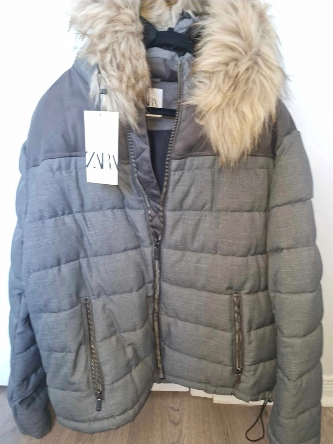 Here's a Zara puffer jacket in size XXL. It's a stylish grey colour and features a cozy faux fur hood. Perfect for staying warm during the colder months!