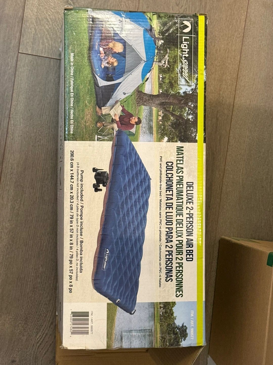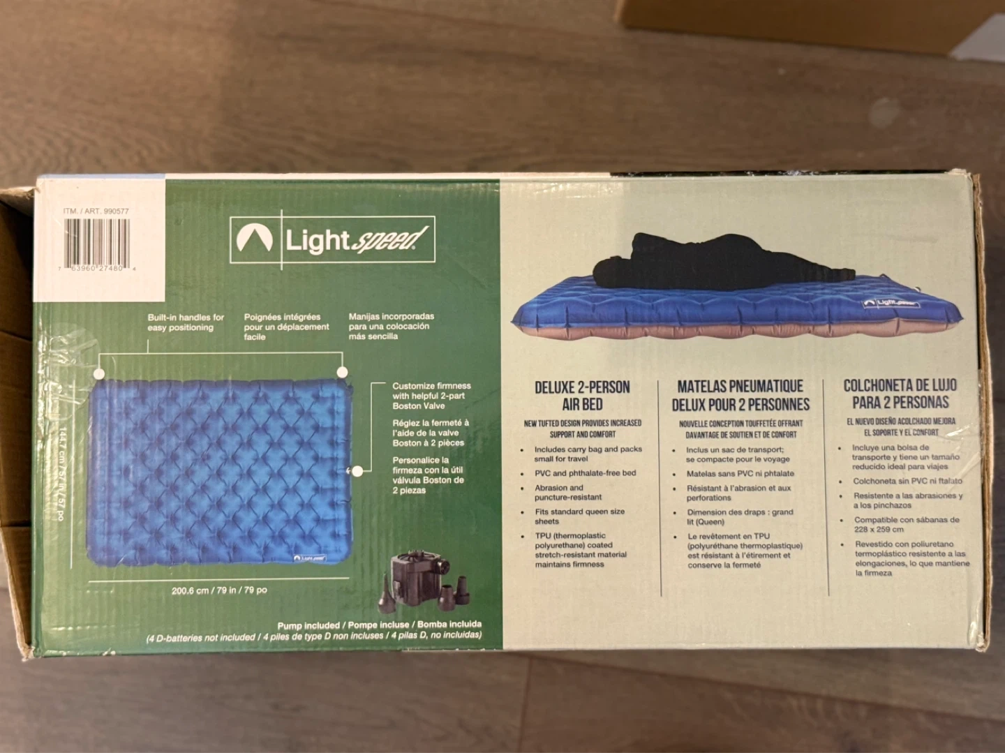 This is a LightSpeed Deluxe 2-person air bed. It's made with PVC and phthalate-free material and features puncture-resistant and abrasion-resistant construction. The bed includes a carry bag and pump for easy transport and setup.