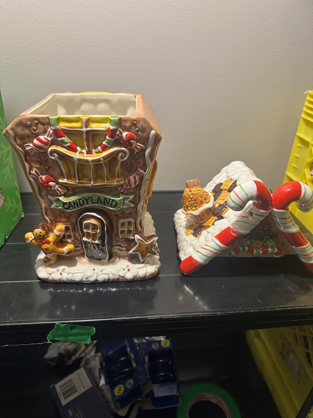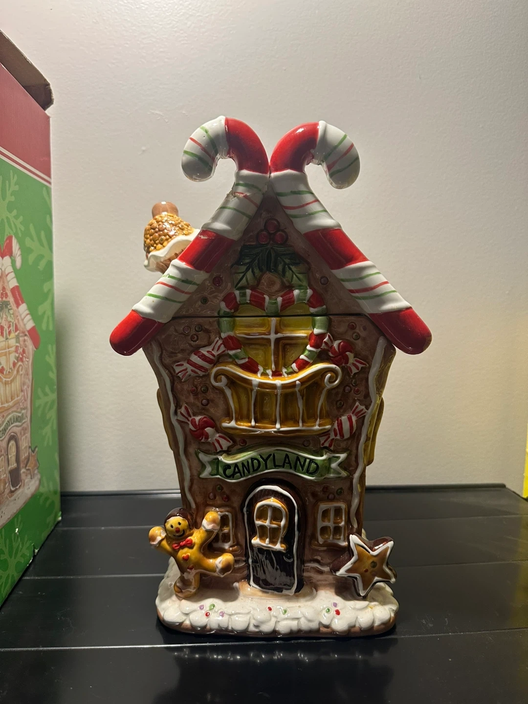 Selling a cute Candyland ceramic cookie jar! It's shaped like a gingerbread house with lots of fun details like candy canes and a gingerbread man. The lid is also decorated with a candy theme. Comes with the original box!