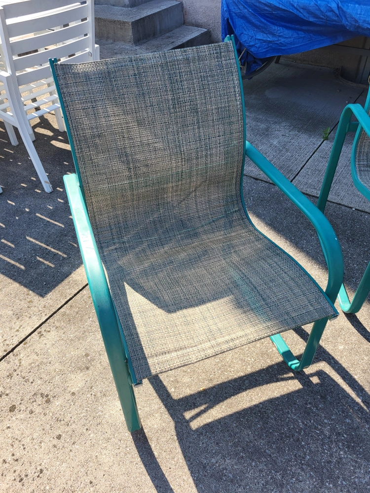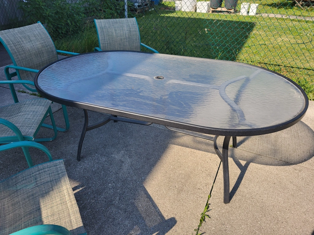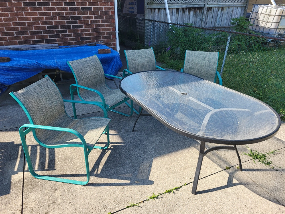 Selling a patio table with four matching chairs. The table has a glass top and a hole in the centre for an umbrella. The chairs are a mesh-like material with teal coloured metal frames. Perfect for enjoying those summer evenings!