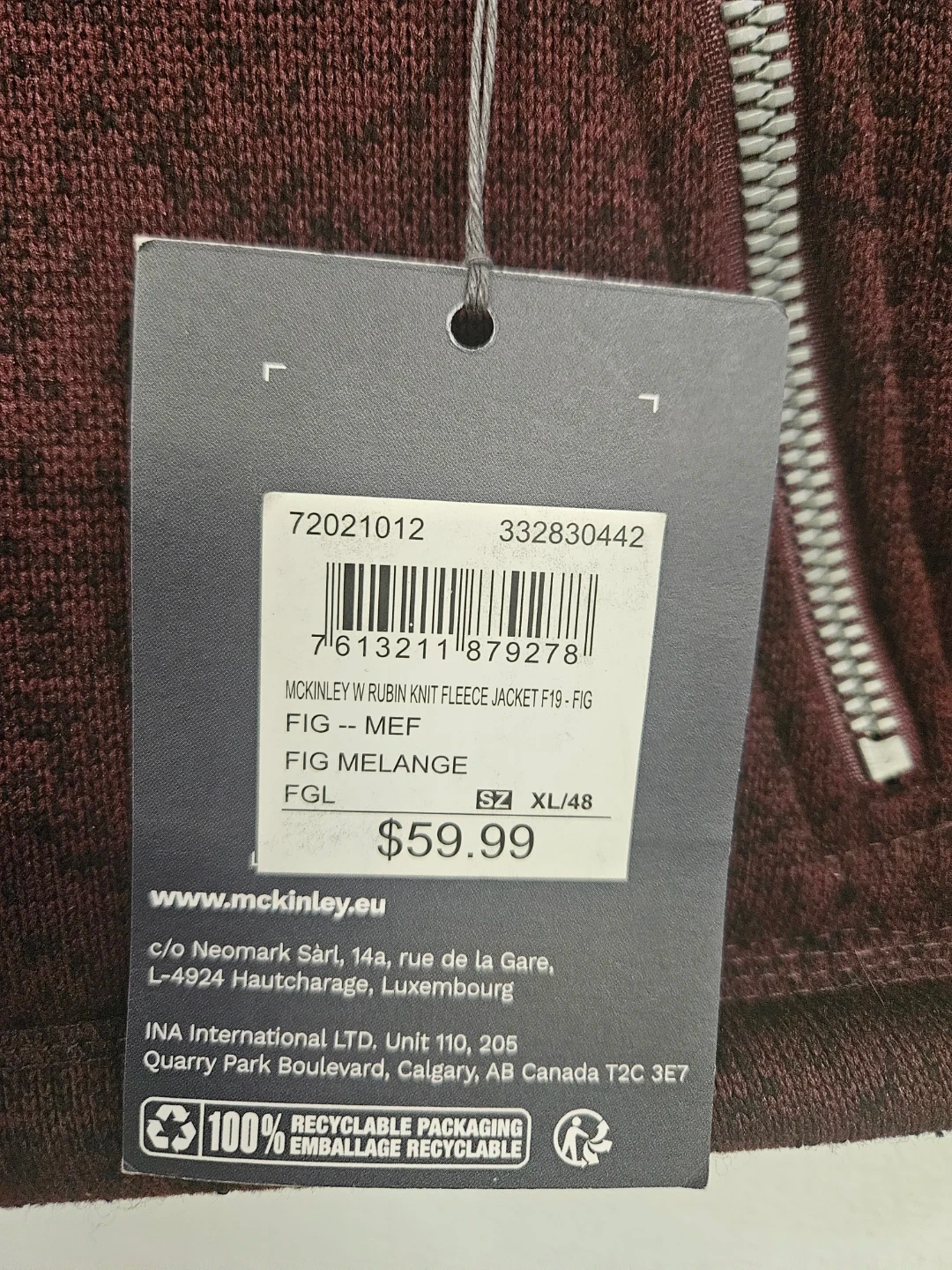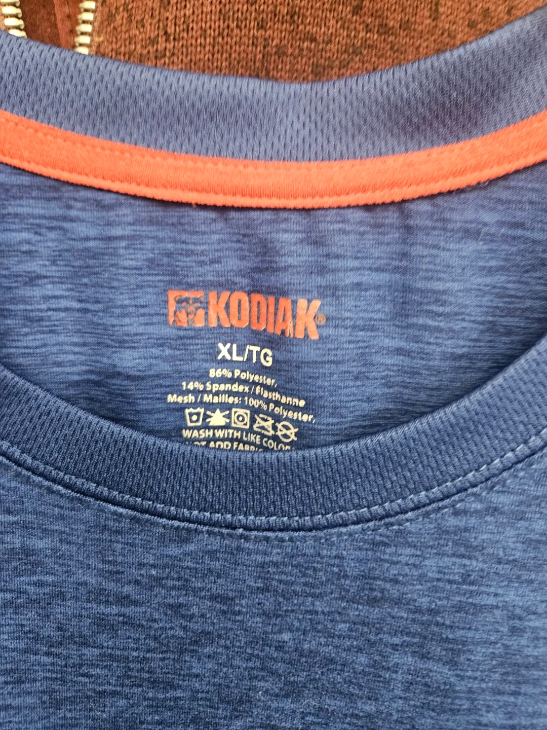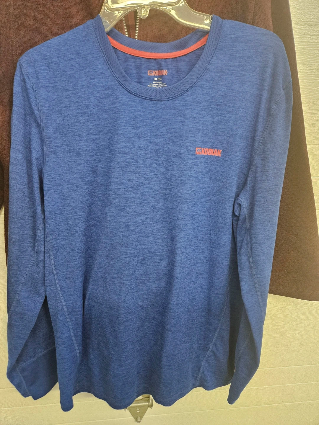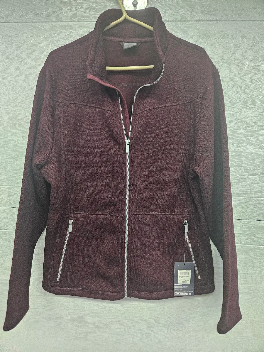 NEW Maroon knit fleece jacket with a full zip and two front pockets. Size XL/48. Also includes a preowned blue Kodiak long-sleeve shirt, size XL/TG. Shirt is made of 56% Polyester, 14% Spandex/Elasthane, and 100% Polyester mesh.