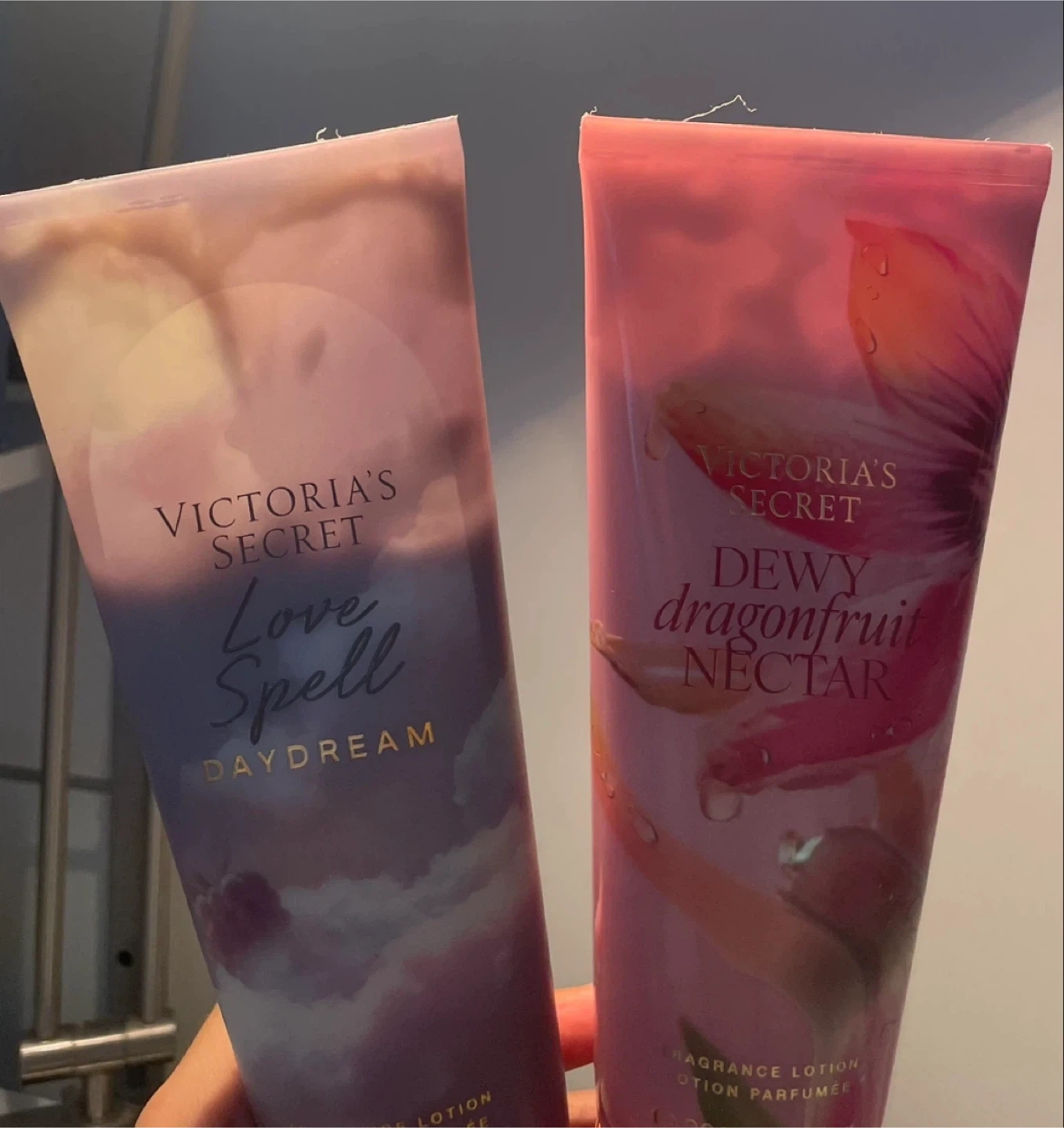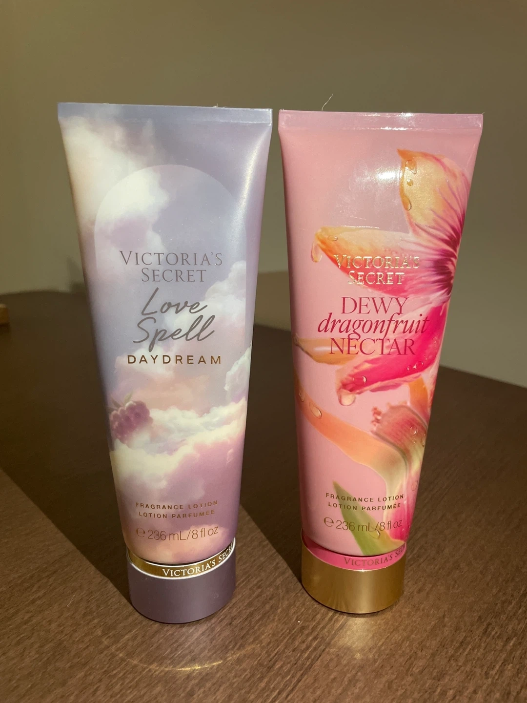 Two Victoria's Secret fragrance lotions are included. One is Love Spell Daydream, and the other is Dewy Dragonfruit Nectar. Each bottle contains 236 mL or 8 fl oz of lotion.