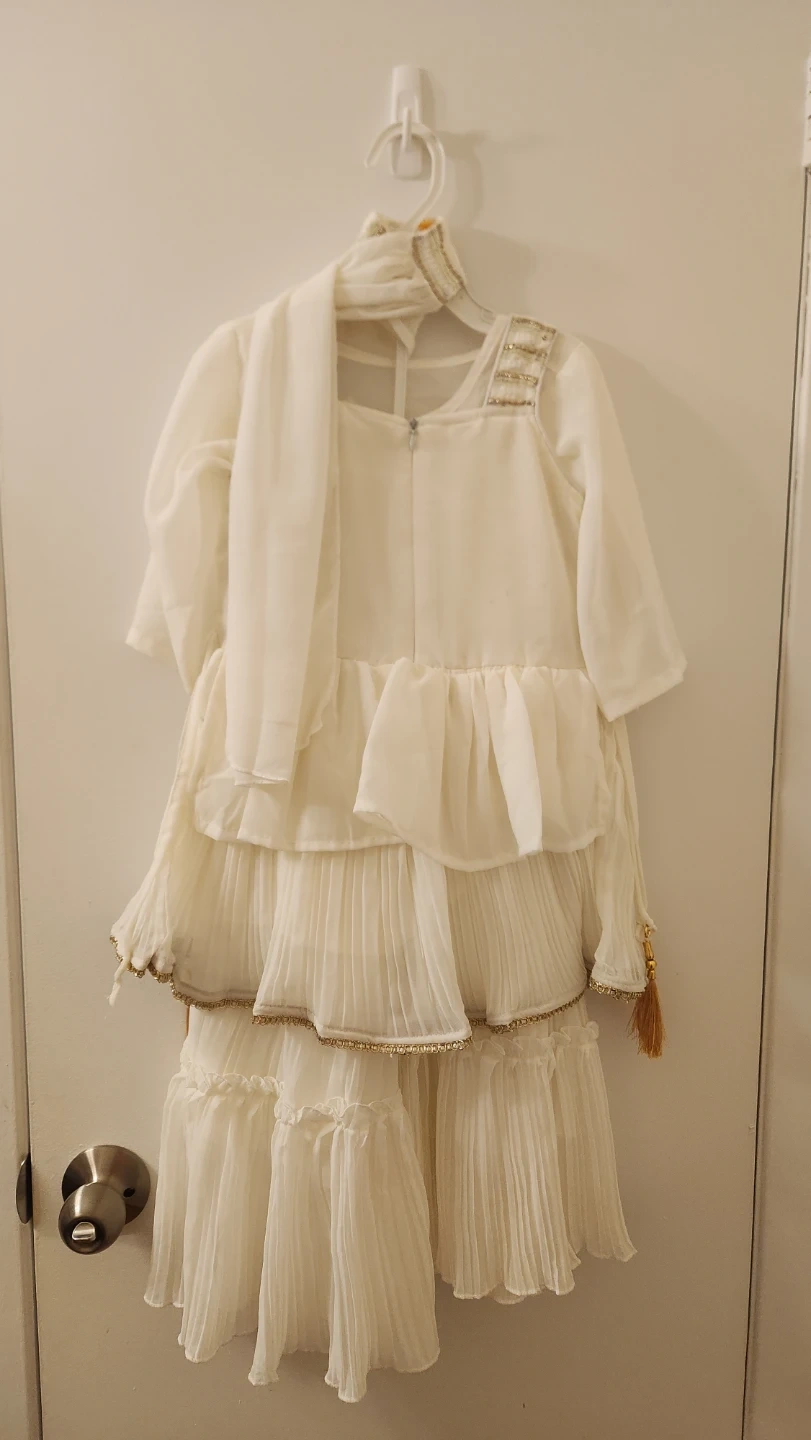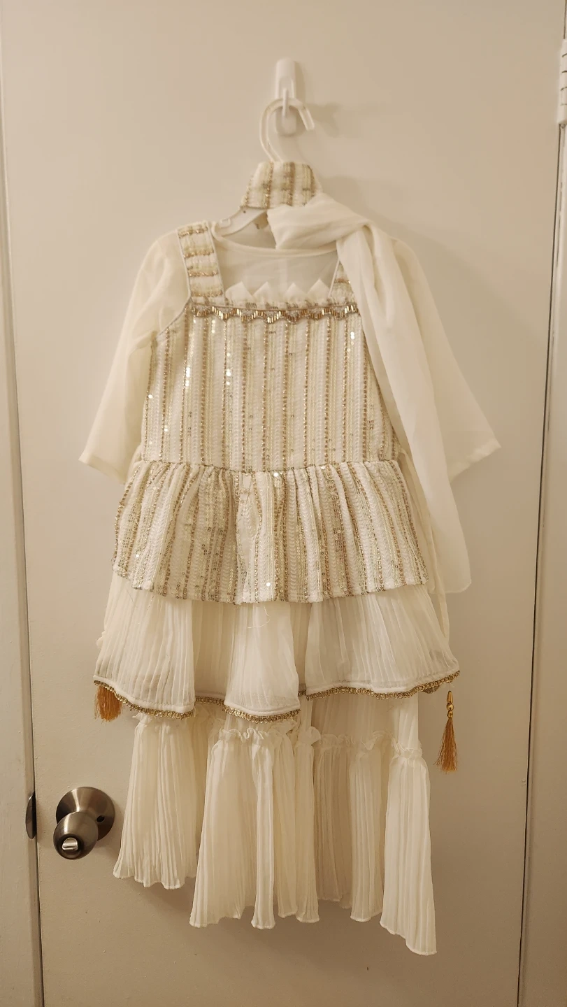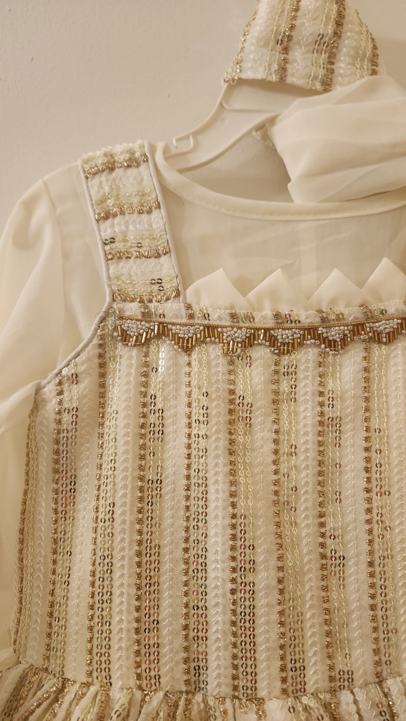Beautiful Salwar for girls, adorned with white and gold sequins. It includes a matching chiffon scarf. Perfect for special occasions and celebrations!