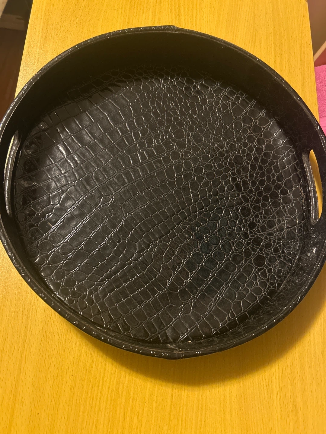 This round serving tray has a faux crocodile texture and two easy-grip handles. It's black with a glossy finish. Great for serving drinks or snacks!