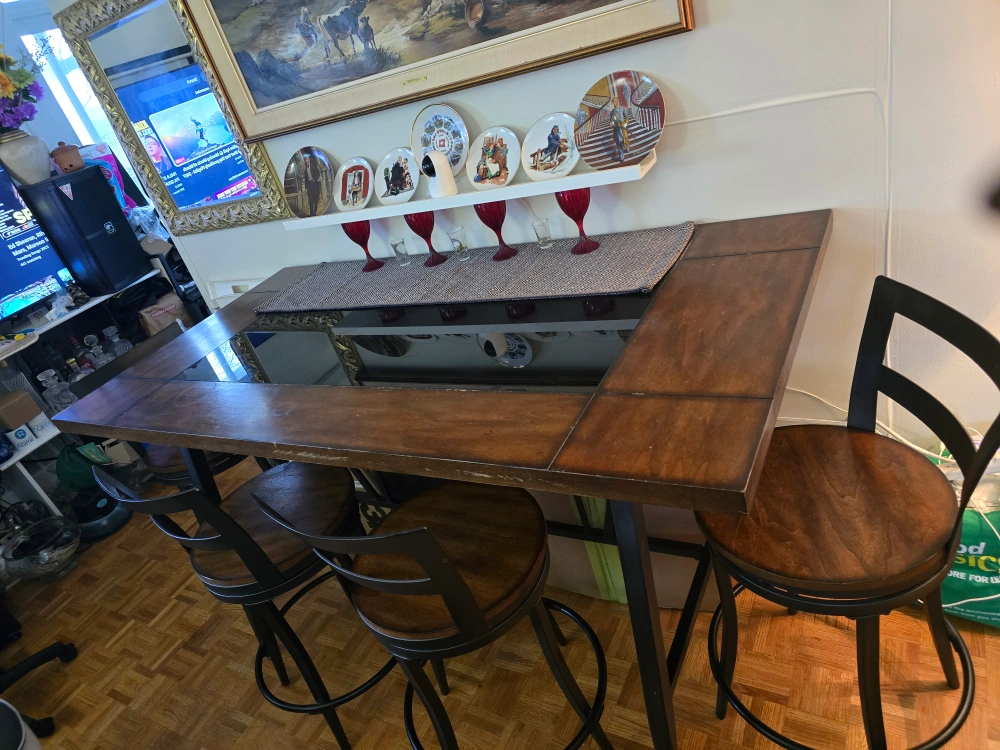 High 6 sitter Dining table with glass at the center and hardwood on the sides / only 4 chairs included. It can be disassembled for easy transport.