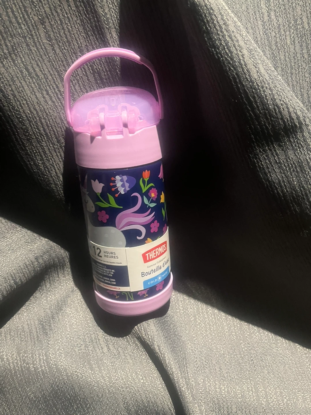 This Thermos water bottle features a fun unicorn design. It keeps cold for 12 hours. The bottle has a convenient carry handle and a push-button lid with a straw.