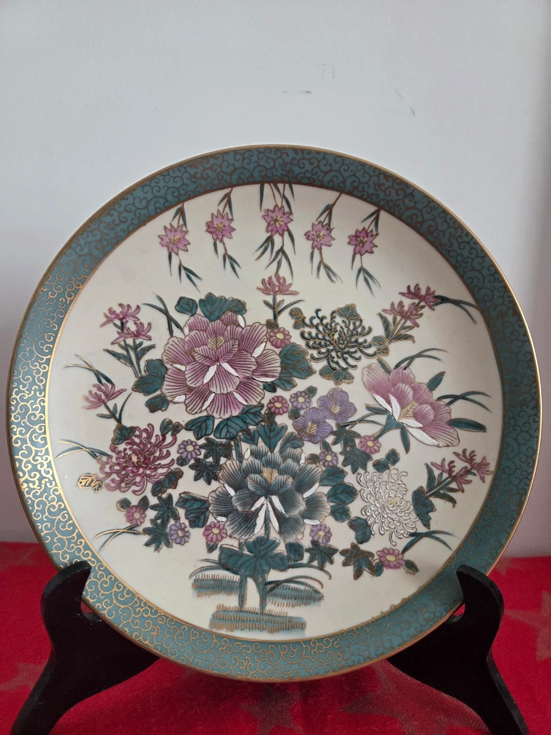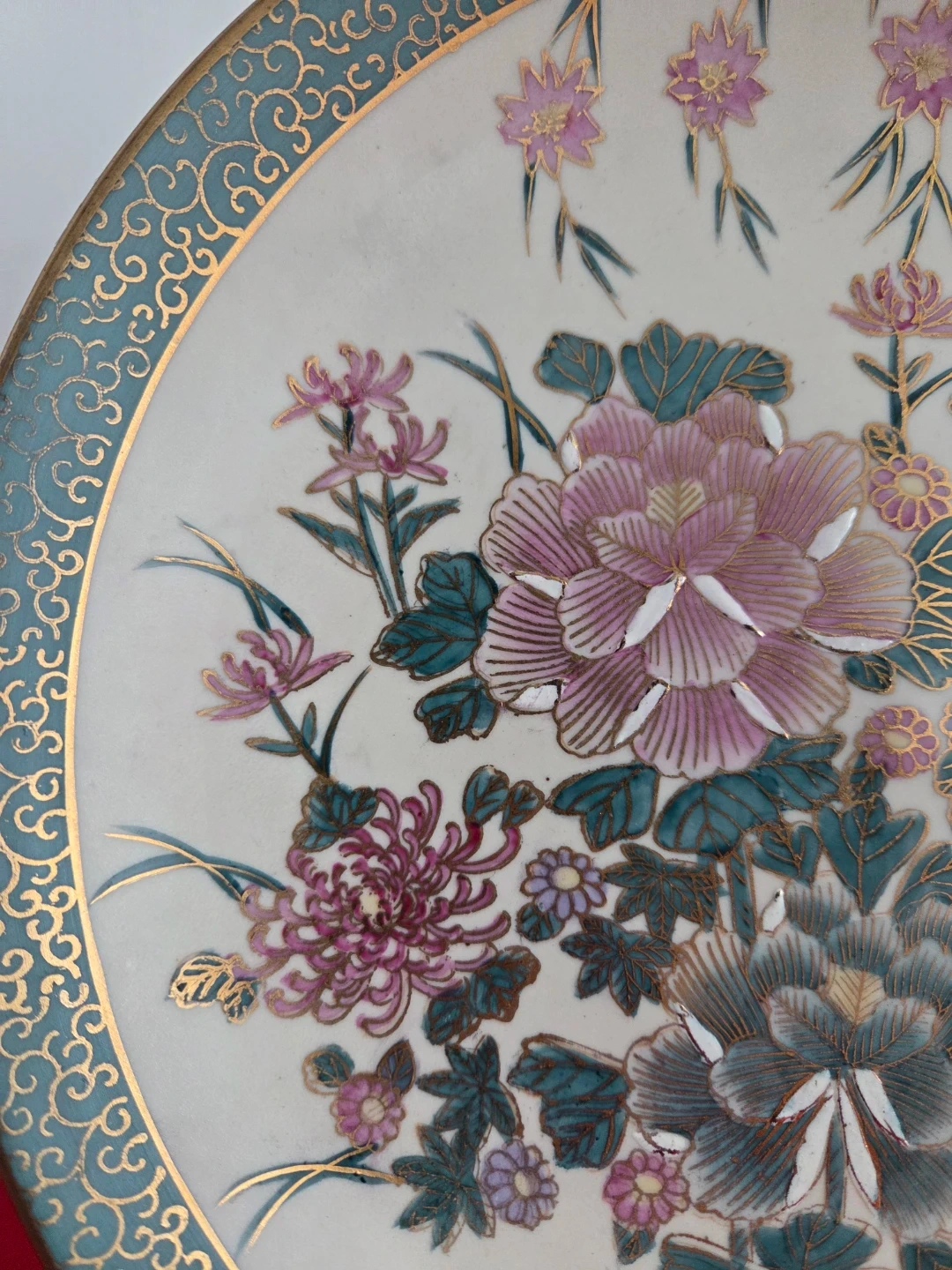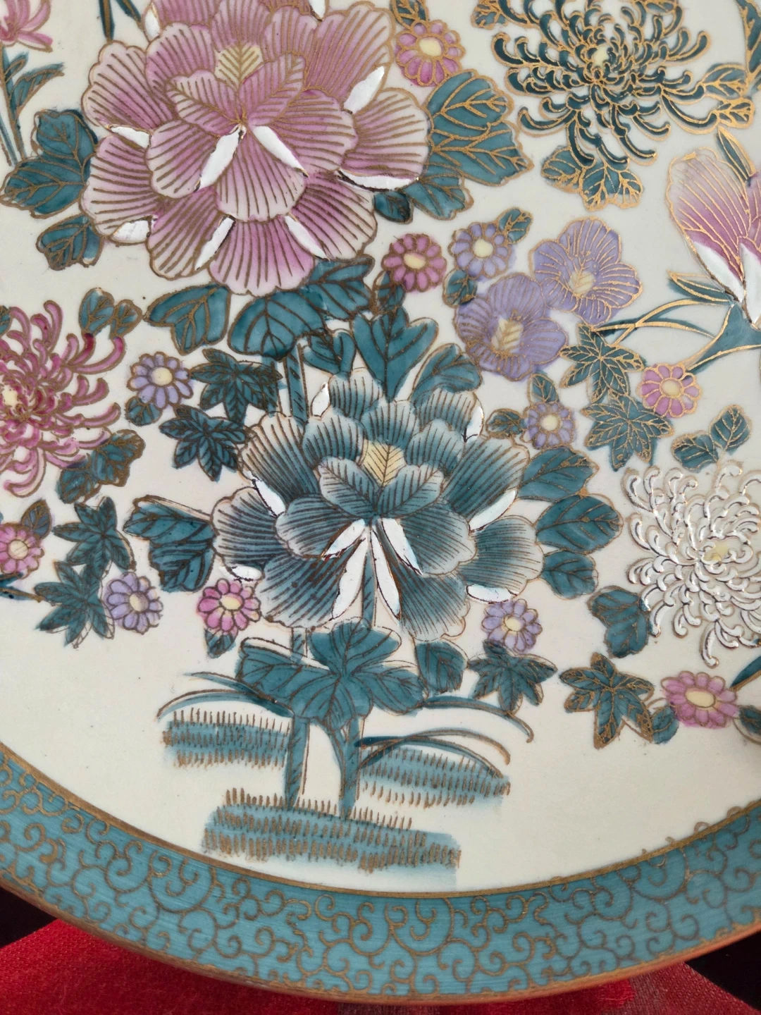 A ceramic plate adorned with a vibrant floral design in pinks, purples, and teal. It features a decorative gold and teal border. This plate's intricate design makes it a lovely decorative piece.