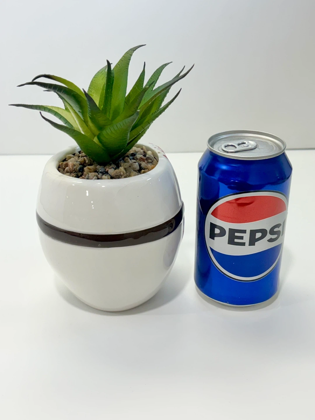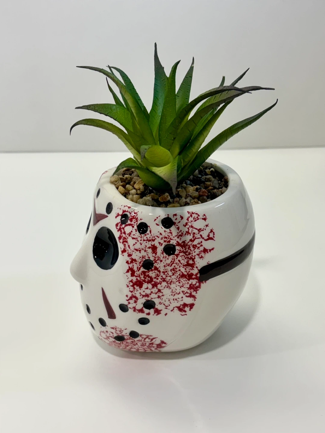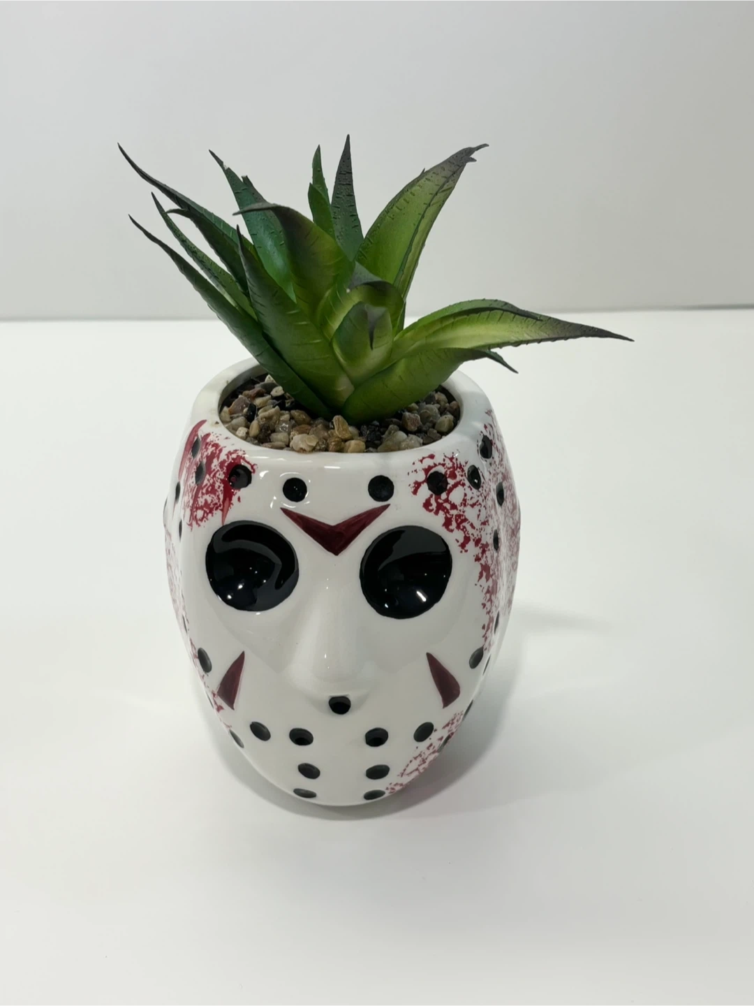 This ceramic planter features the white mask design with red splatters and black details, resembling a classic horror movie character. It comes with a faux green succulent plant and small stones for decoration. It's a unique piece for any desk or shelf!