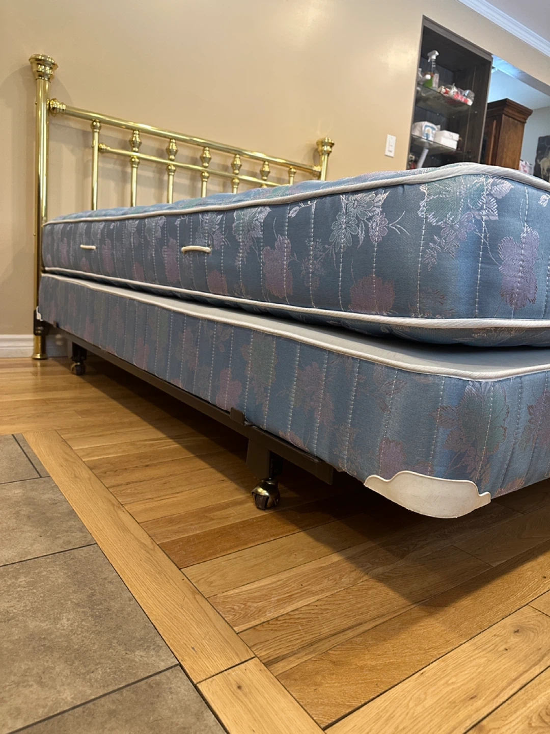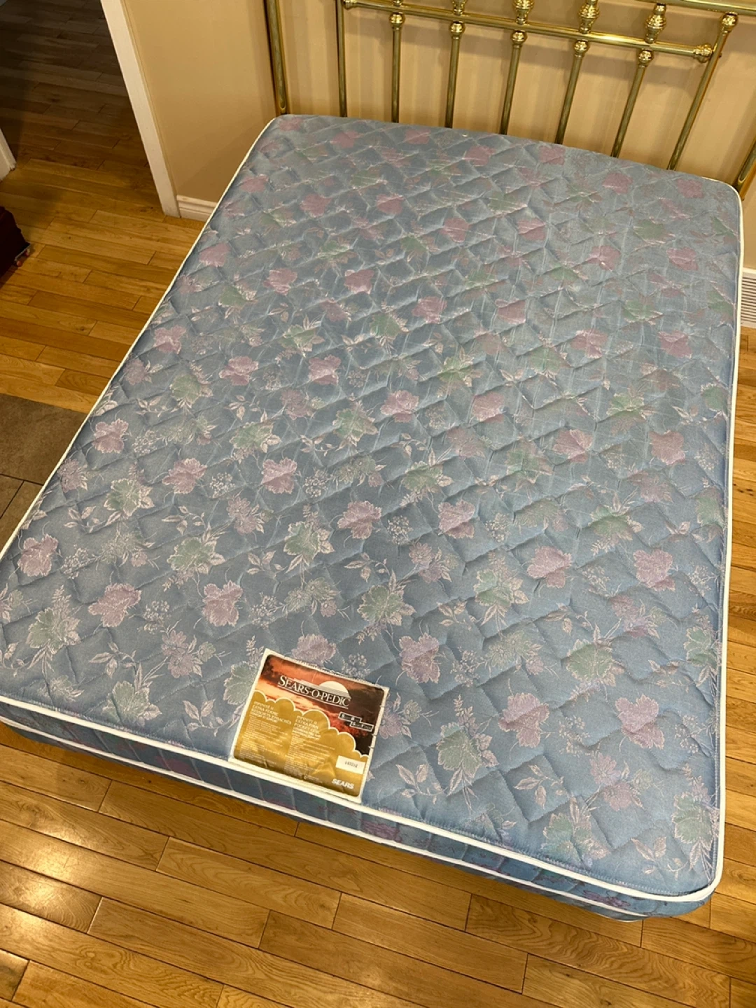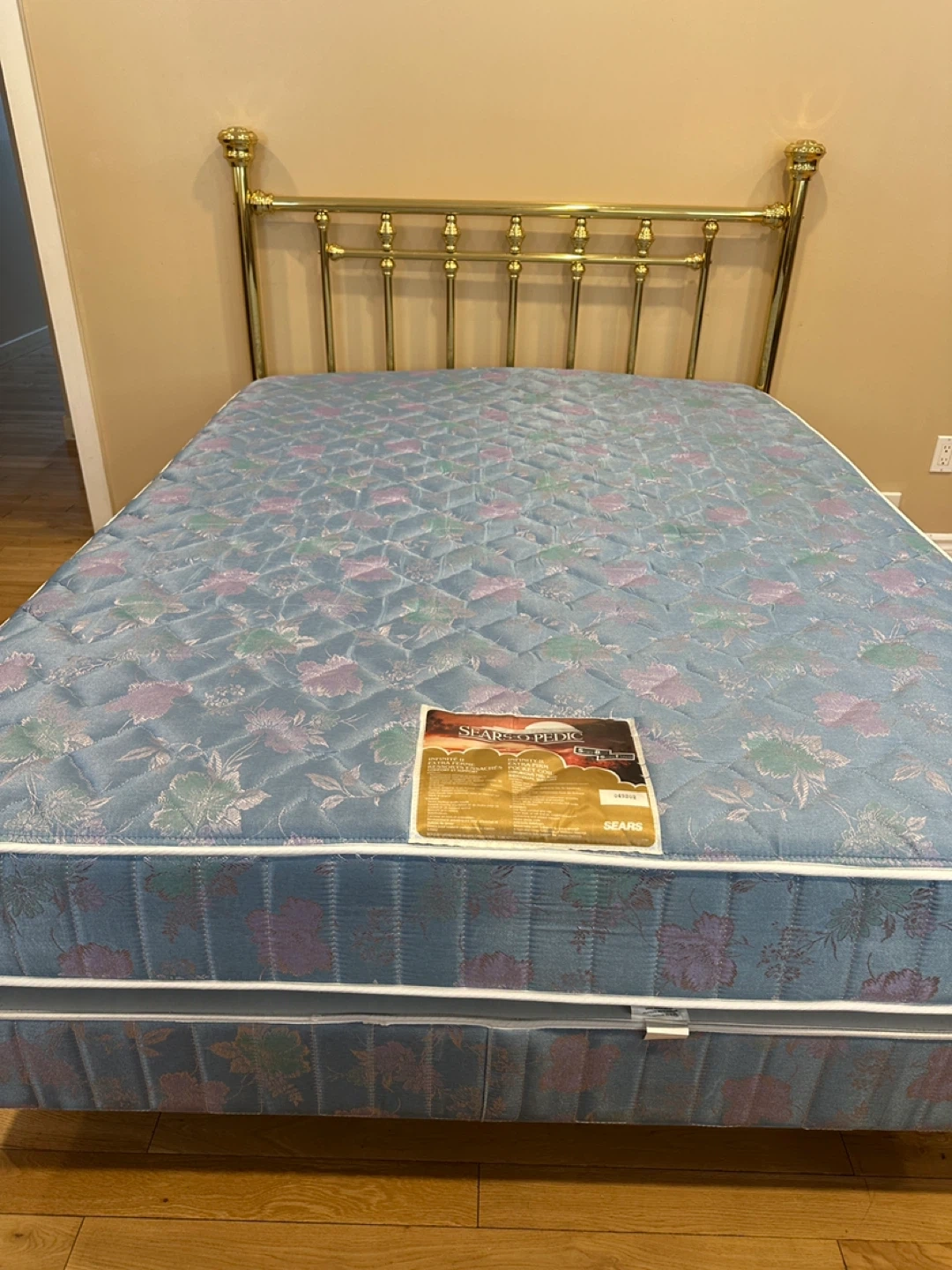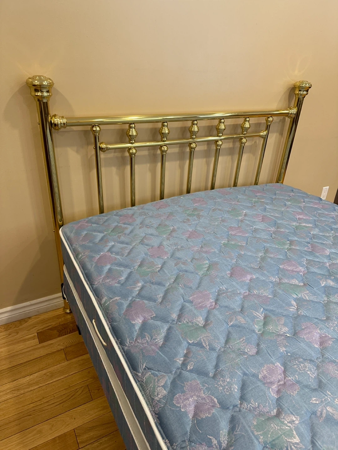 Beautiful and sturdy queen bed set, everything included and ready to use! The brass headboard has a classic, elegant design that gives the room a timeless look. Frame is solid and stable. Mattress and boxspring are clean and in good condition.