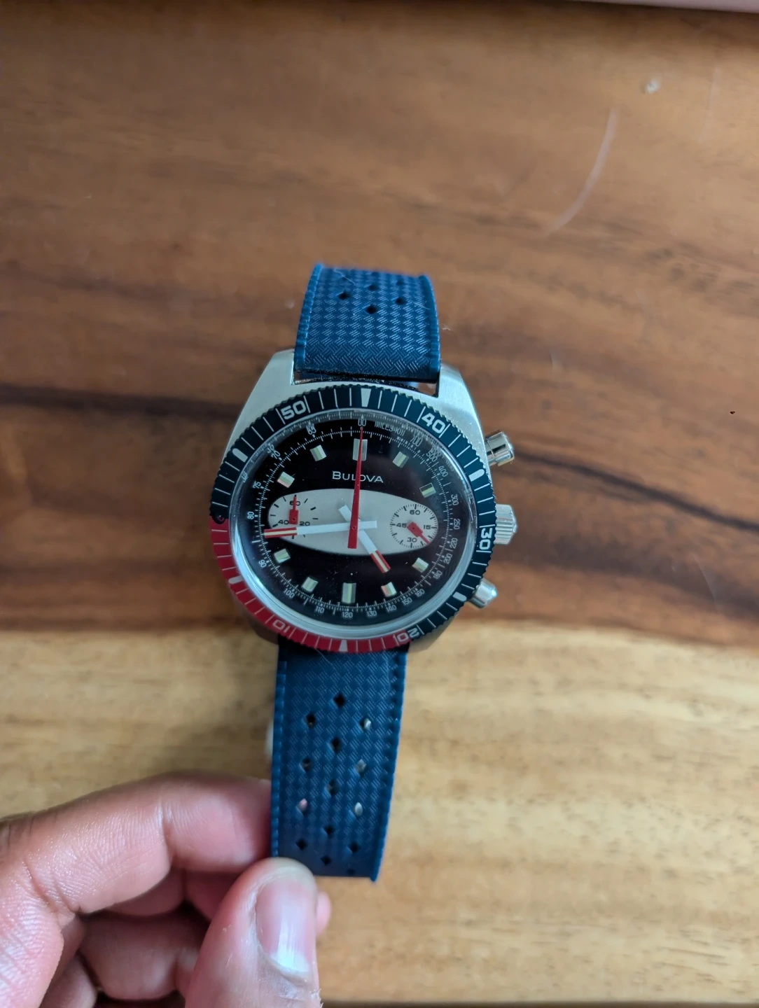 This is a Bulova chronograph watch with a blue rubber strap. It features a Japanese quartz movement.