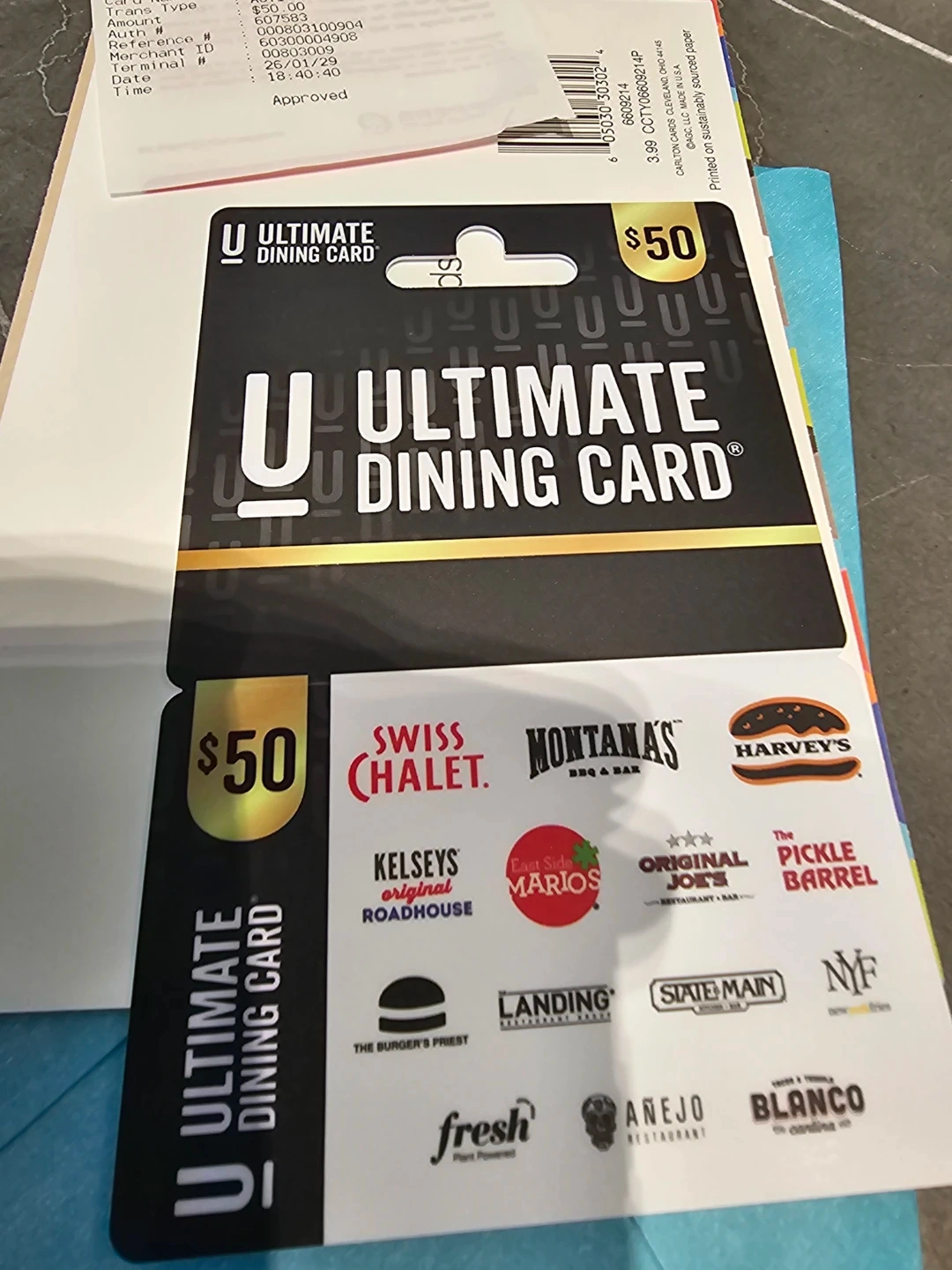 This is a $50 Ultimate Dining Card. It's valid at various restaurants like Swiss Chalet, Montana's, and Harvey's. Use it for a meal out!