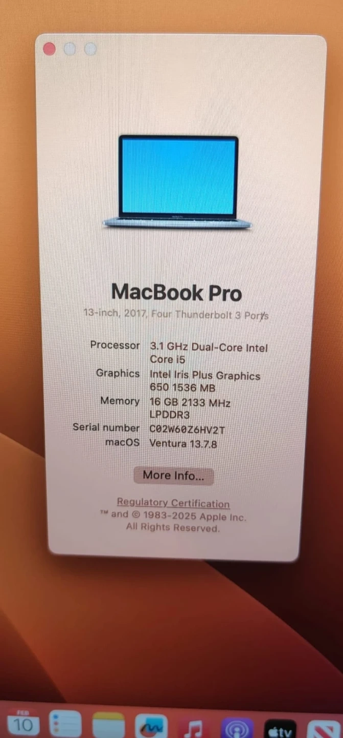 This is a 2017 MacBook Pro with a 3.1 GHz Dual-Core Intel Core i5 processor and 16 GB of memory and 256gb storage. It runs on macOS Ventura 13.7.8. This model has 4 Thunderbolt 3 ports.