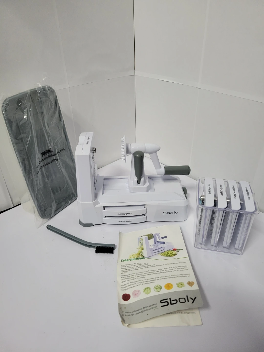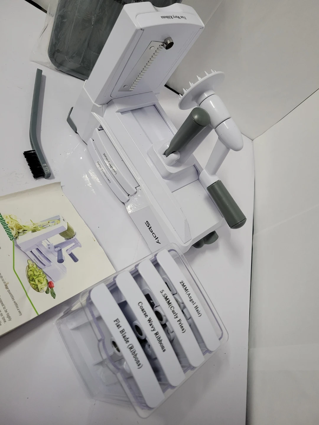 This Sboly vegetable spiralizer comes with multiple blade attachments for different cuts. It includes a cleaning brush and a container for the spiralized vegetables.