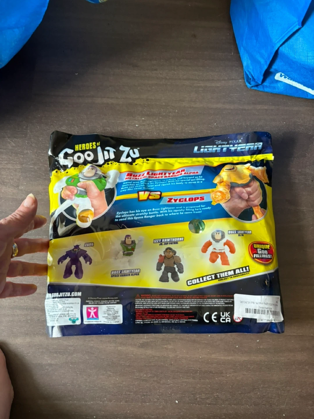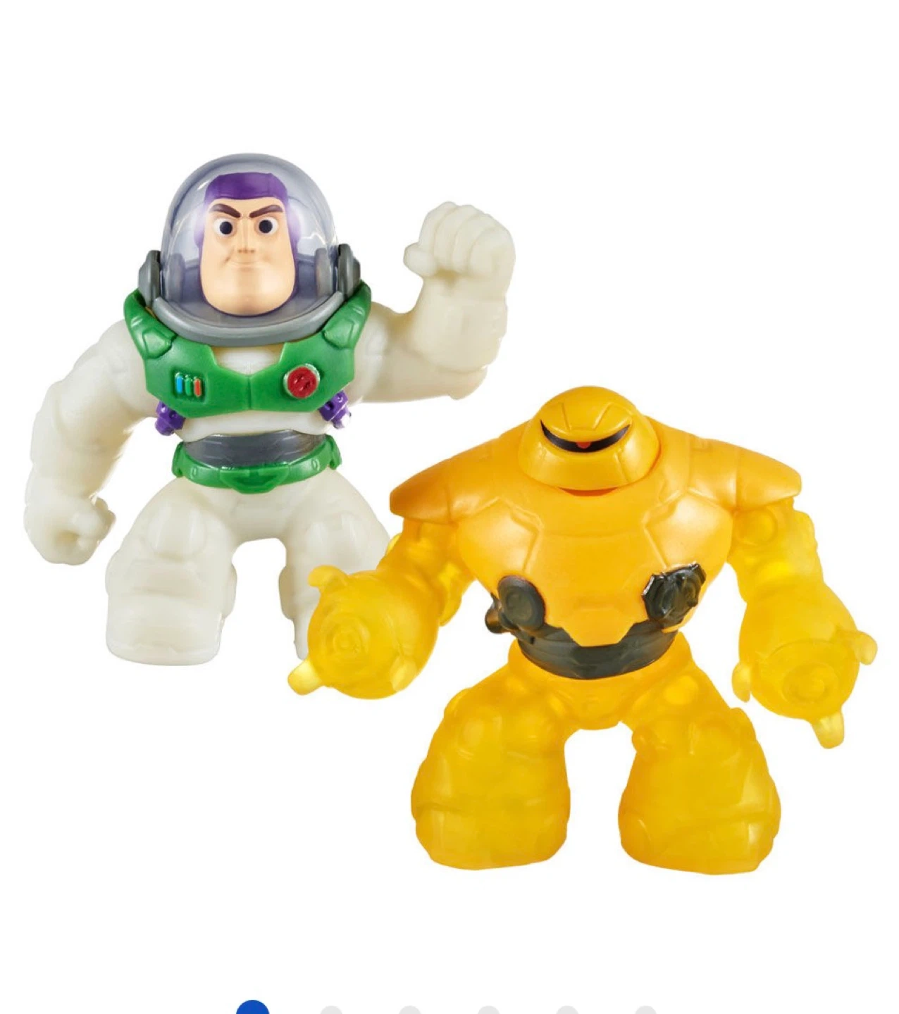 This set features a stretchy, gel-filled Buzz Lightyear and a squishy water bead-filled Cyclops figure. Both figures can stretch up to three times their original size and return to their shape. Designed for children aged 4 and up.