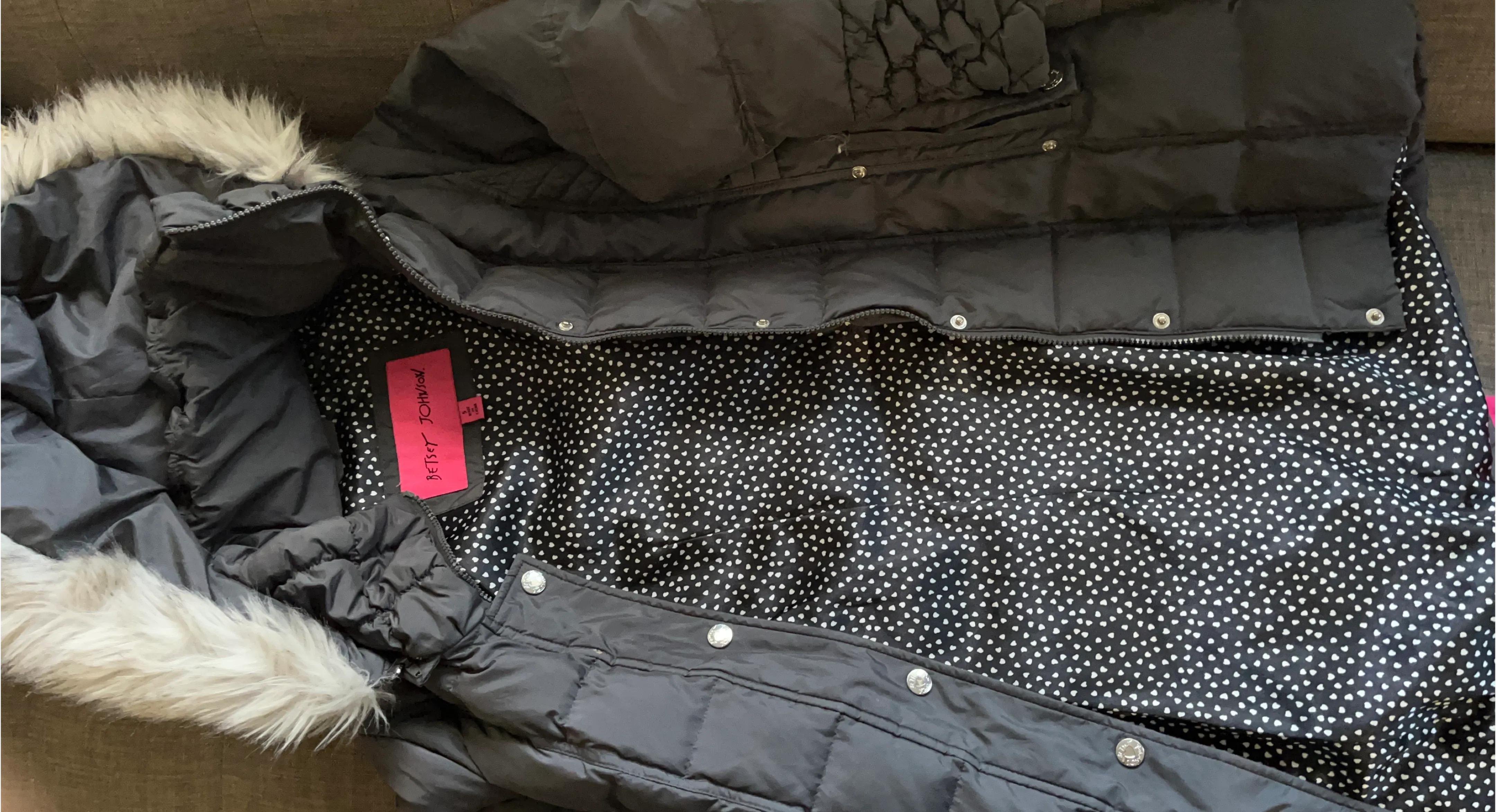 Betsey Johnson women's puffer jacket in charcoal grey. It features a faux fur-trimmed hood and a black lining with a white heart pattern. This coat is stylish and warm for colder weather. Size medium.