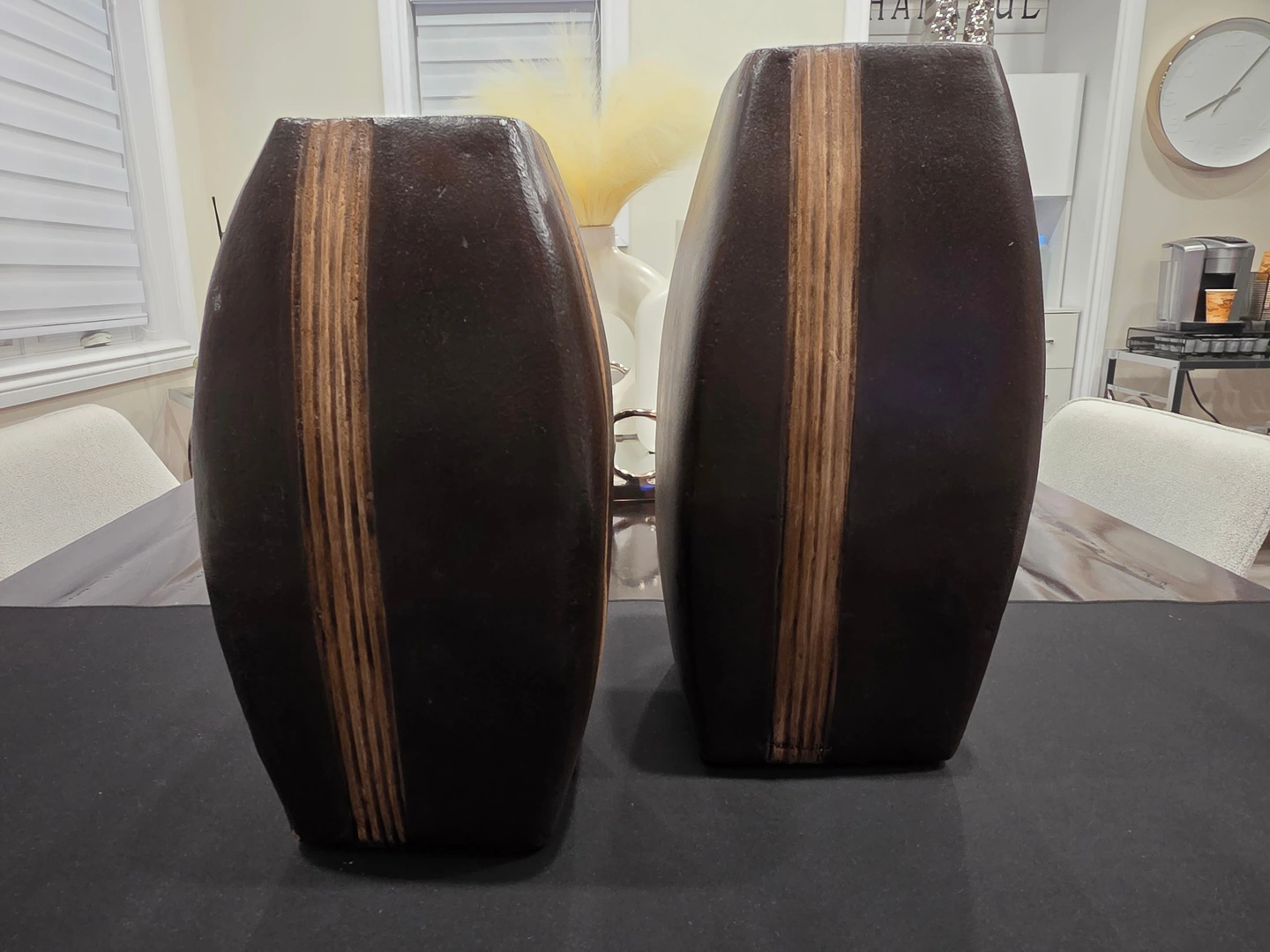 A stunning pair of artisan sculptural vases featuring a rich matte espresso finish and a striking vertical inlay detail. Their curved rectangular silhouettes create a bold architectural presence, the kind of elevated décor typically found in boutique design studios or luxury home staging collections.