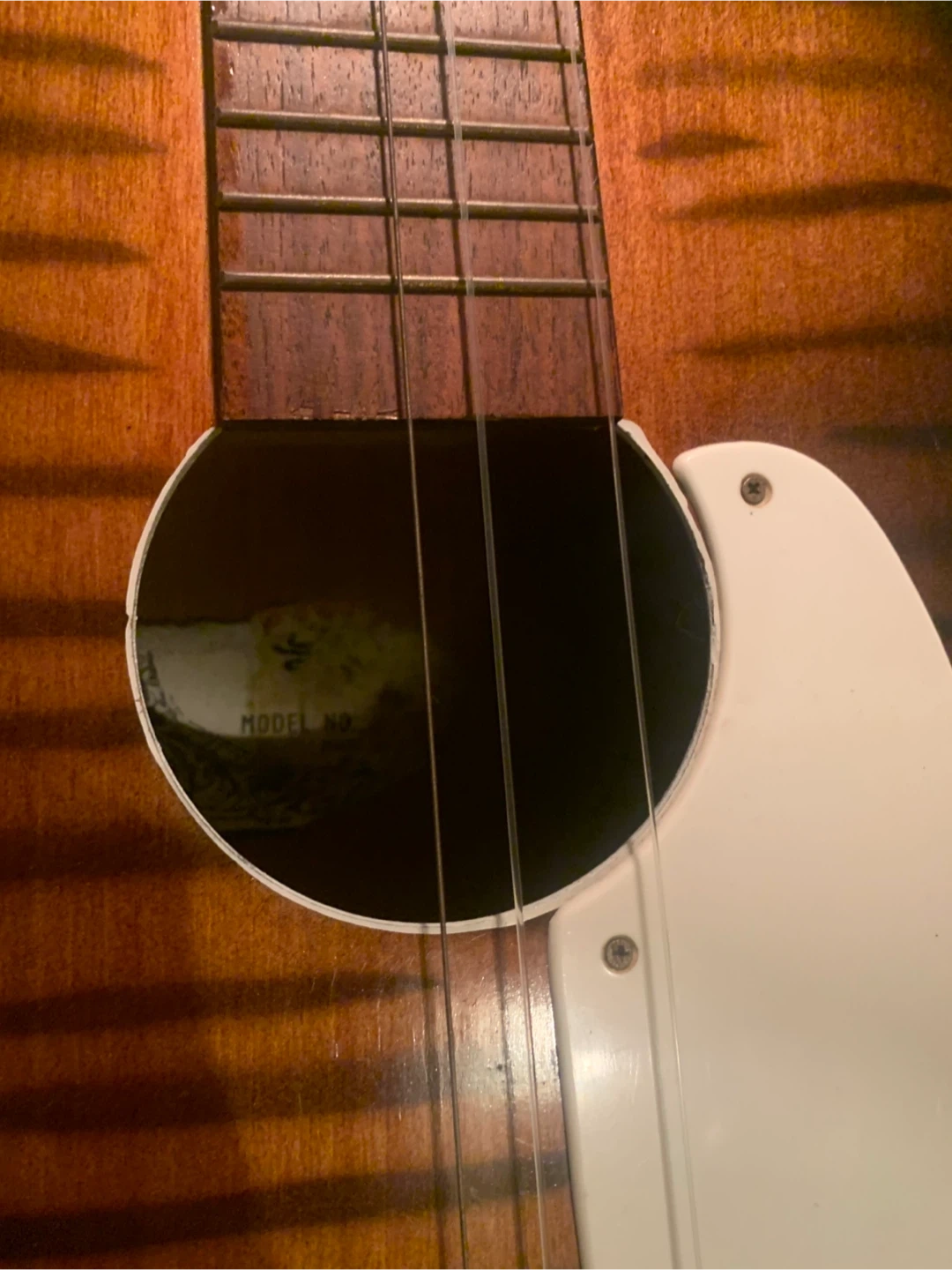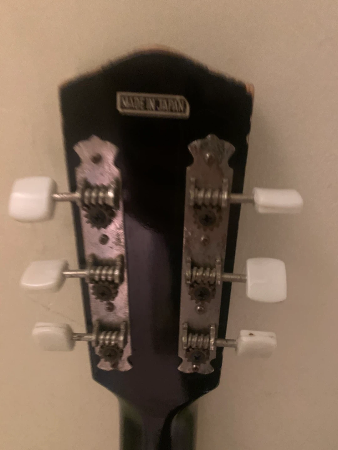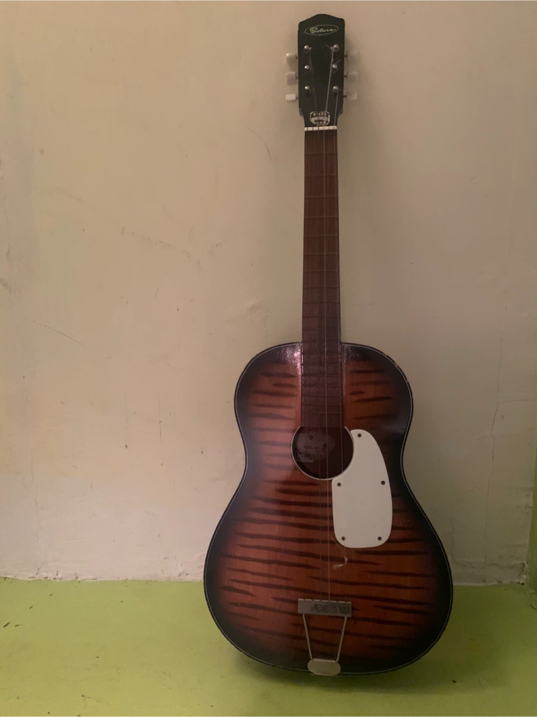 This is a vintage Saturn acoustic guitar made in Japan. It has a steel-reinforced neck. The body has a sunburst finish with tiger stripe accents.