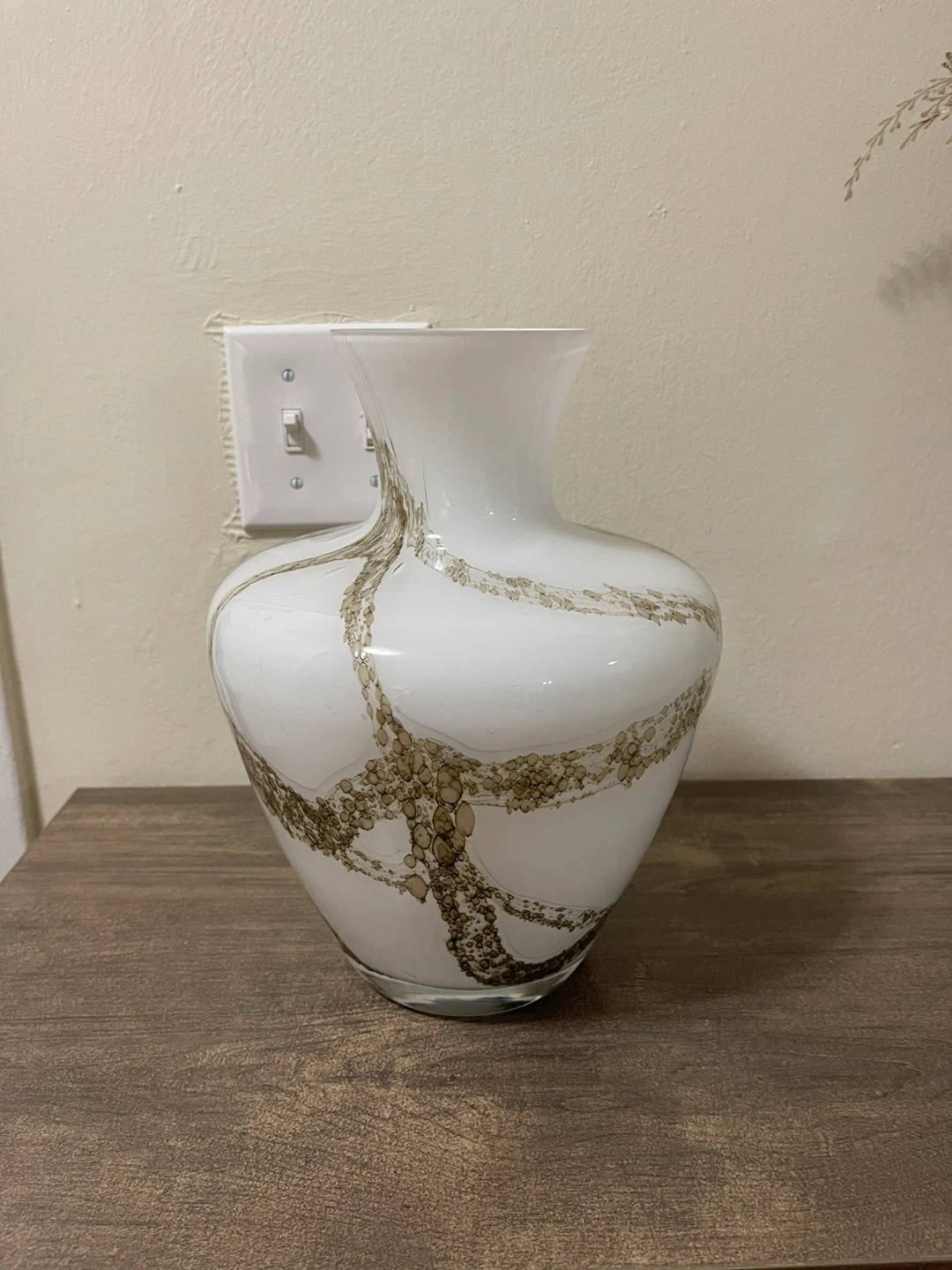 A lovely white glass vase featuring a unique brown swirling pattern. Its elegant design makes it a beautiful centrepiece for any room. Perfect for displaying fresh flowers or as a standalone decorative item.