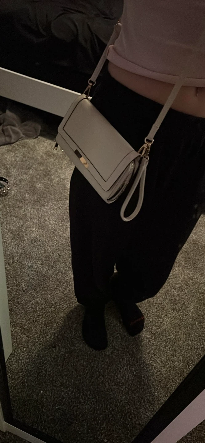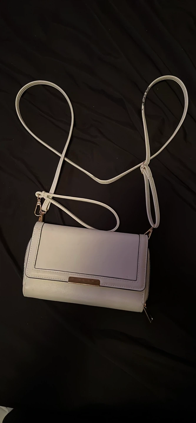 A stylish white wallet clutch with a detachable crossbody strap. It's got a zip-around closure and a gold-tone accent. Perfect for carrying your essentials on the go!