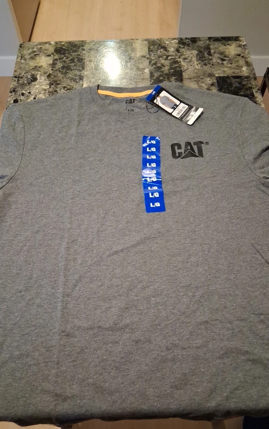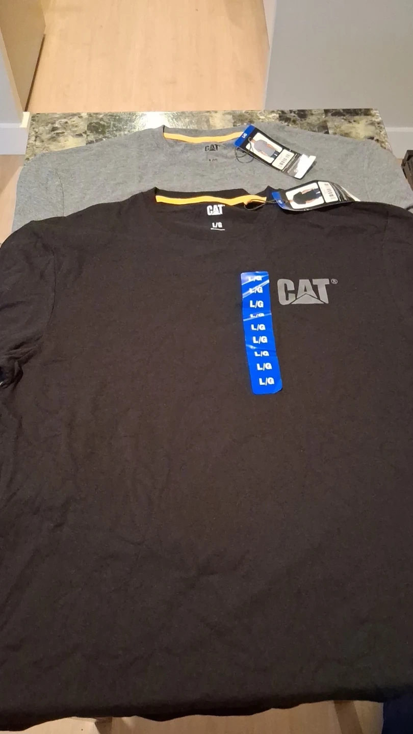 Get two CAT t-shirts, one black and one grey, both size large. They're made for comfort and durability. Ready for work or casual wear!