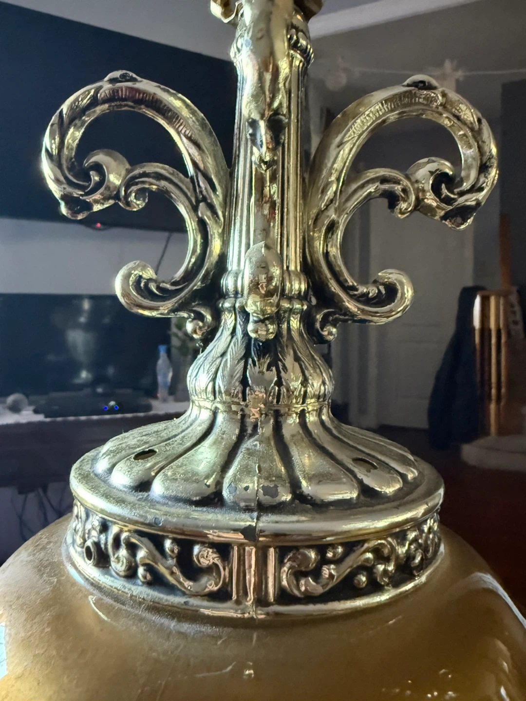 These vintage lamps have a unique ornate design with jewels. They're made of a gold-tone metal base and a cream-coloured ceramic body. This pair would add a classic touch to any room. 100 each