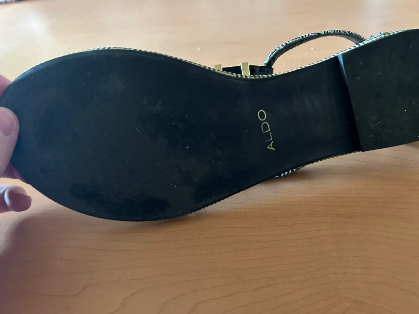 These ALDO flat sandals feature a black and white woven pattern with gold stud accents. They have adjustable ankle straps for a secure fit. Perfect for casual summer outings!