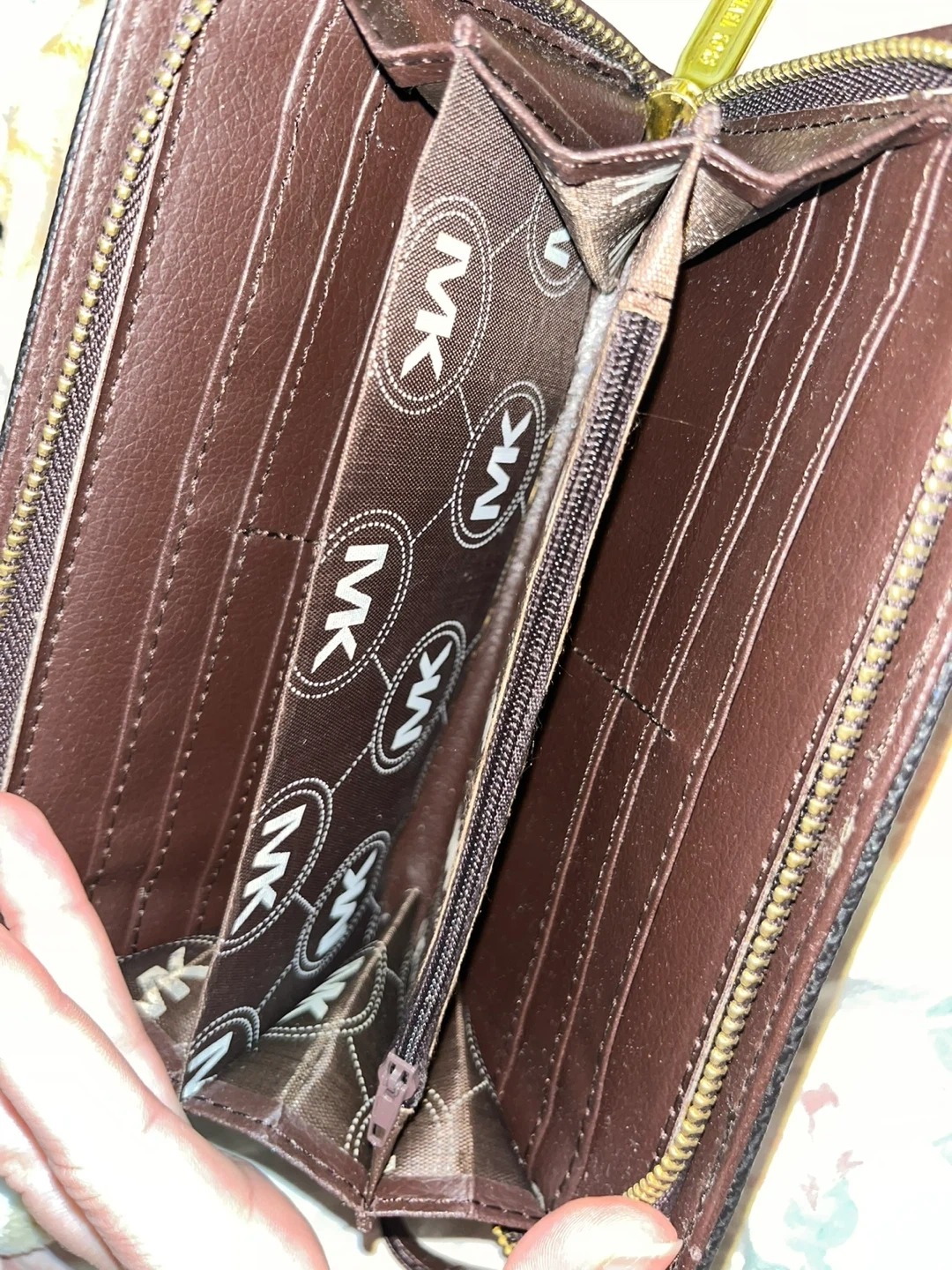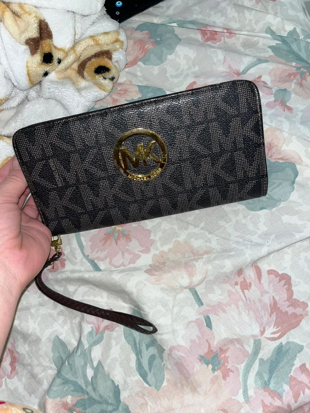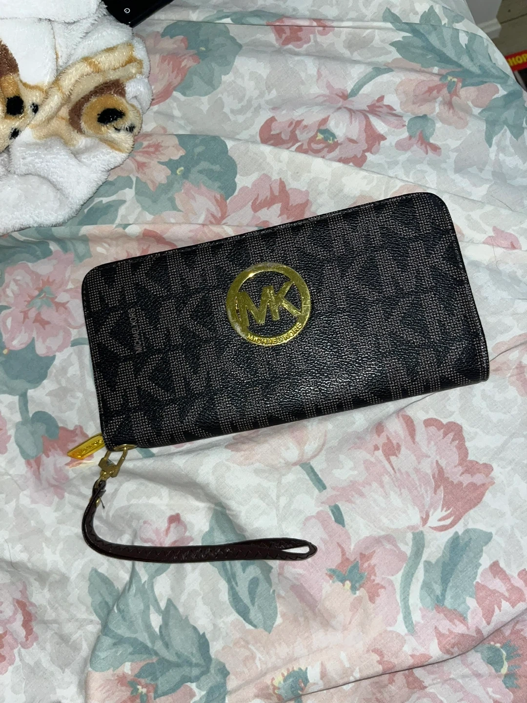 Selling a Michael Kors wristlet wallet. It's in good condition and has a zipper closure. Perfect for carrying your essentials! Perfect on the inside and just slight scratches on the MK metal emblem.